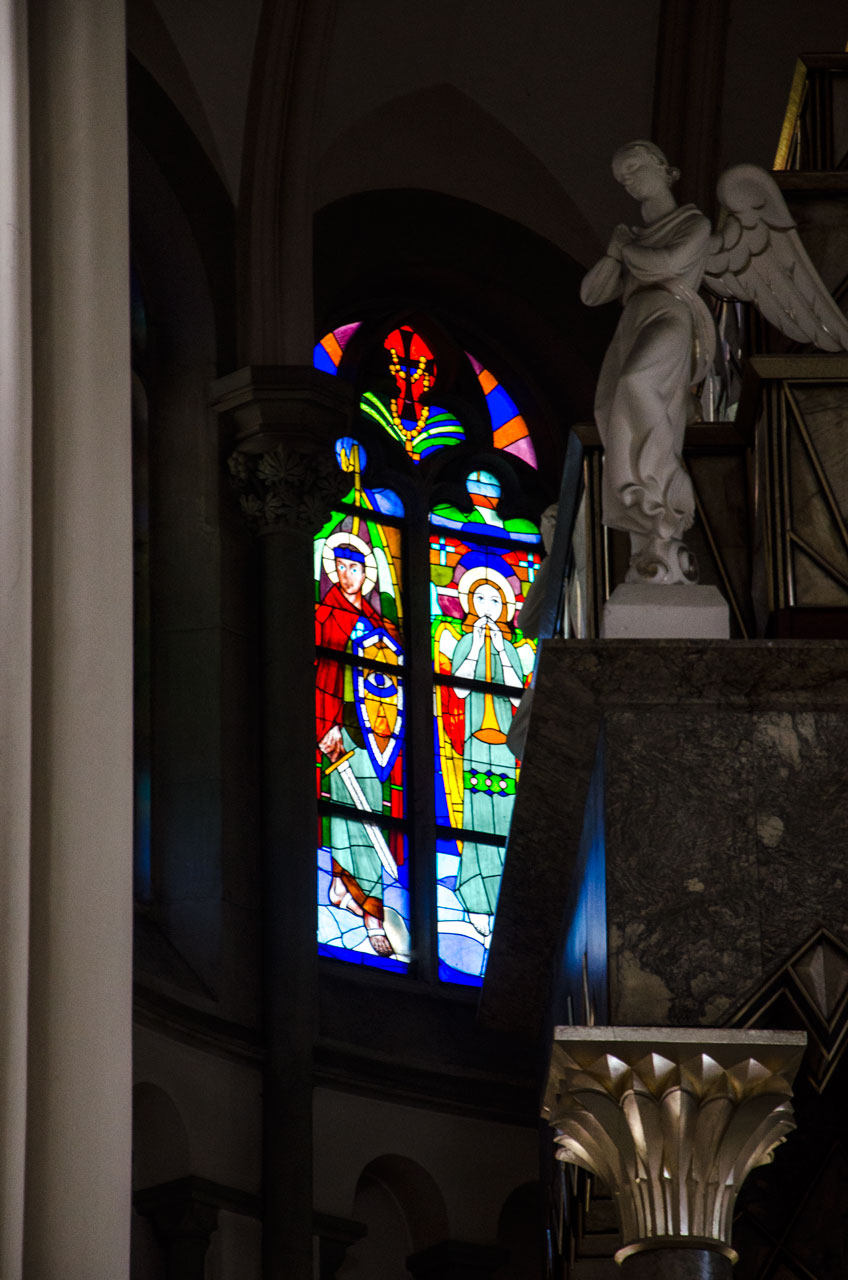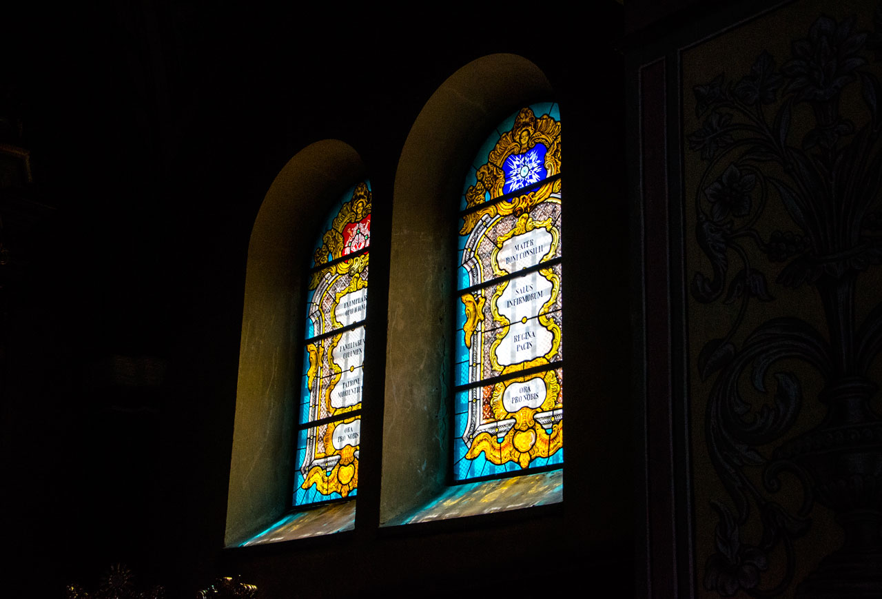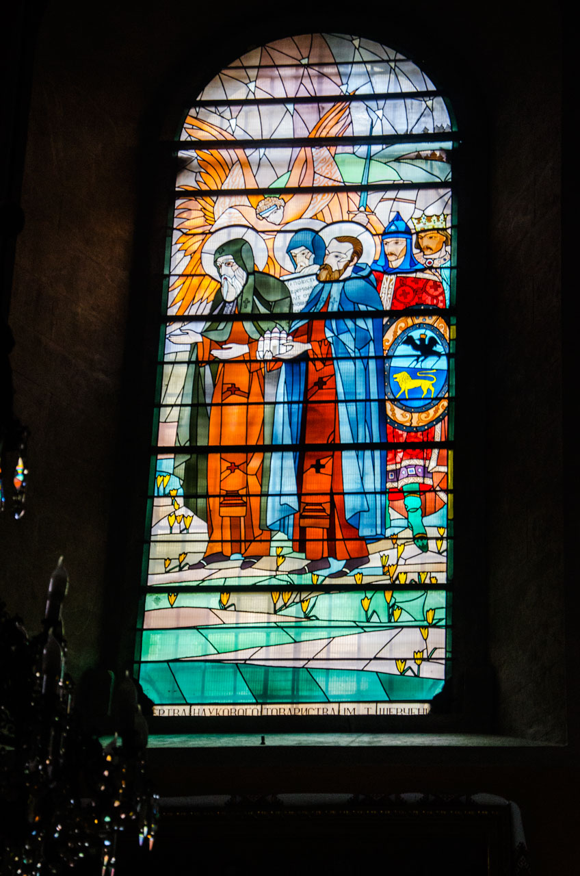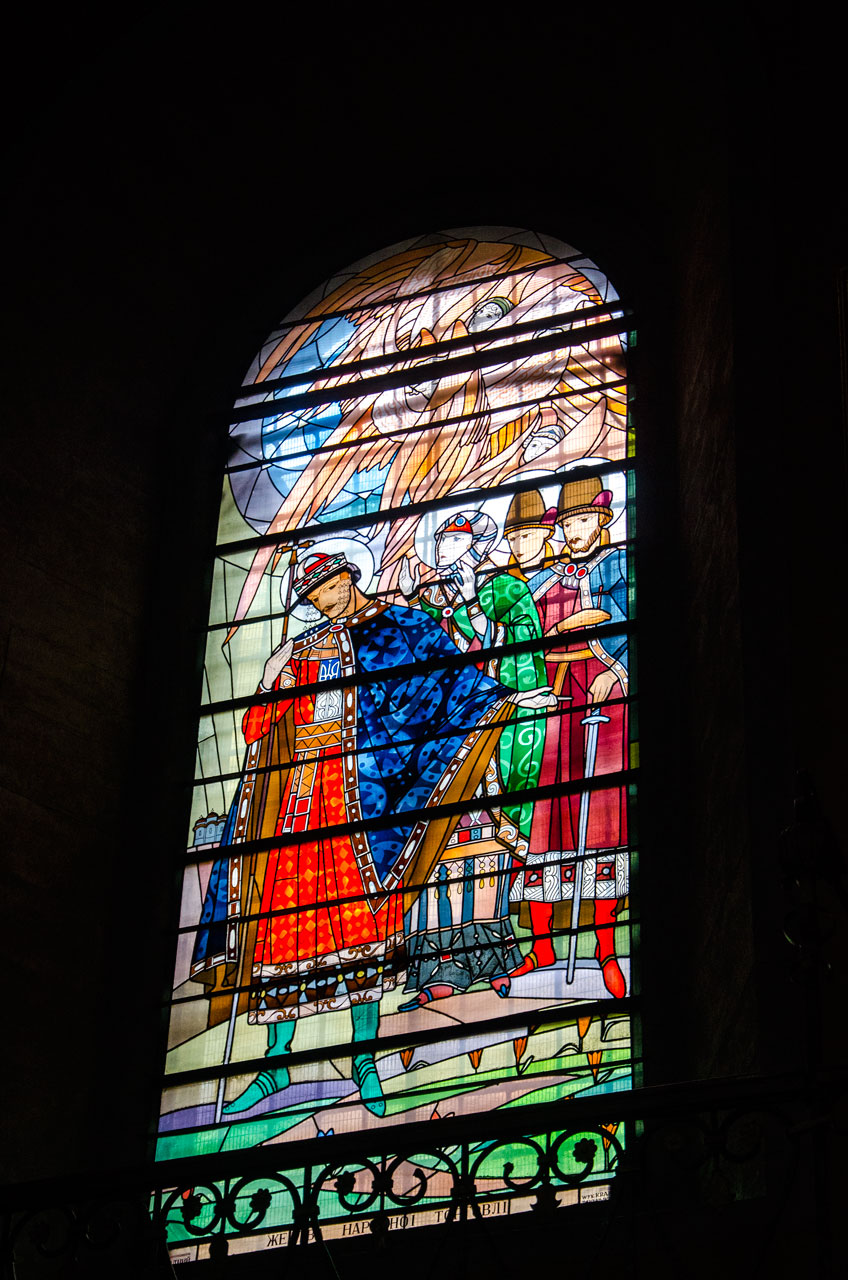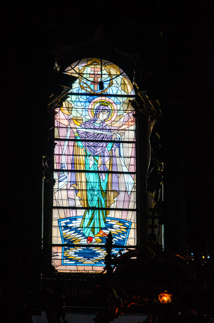 Між двома світовими війнами вікна святині прикрасили вітражами про українську церковну історію: хрещення України, життя галицької Русі та діяльність фундаторів храму. Цим вітражам менше ста років, проте їхнього автора називають одним із найвизначніших митців ХХ століття, який особливо відзначився як іконописець та вітражист.