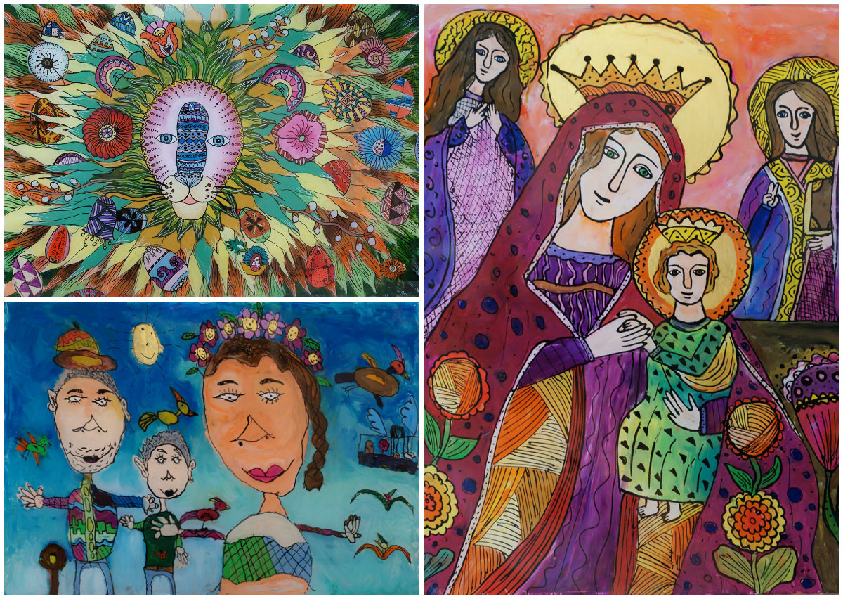 Юні митці олійними фарбами на склі відтворили своє бачення реального світу і відкрили завісу того, що існує тільки в дитячій уяві. «На їхніх картинах можна побачити, як гриви львівських левів розквітають квітами та писанками, як пташки безпечно сідають на котячі вуса, немов на гілки, а біла мишка дружить із кольоровим котиком. Привертають увагу ангелики, які виграють на скрипочках та сопілочках радісні великодні мотиви; як мати пригортає своє дитятко, як під весняний щебет птахів проростають дивні квіти, як по землі мчать кольорові потяги, а у небі пливуть кораблі та будиночки на повітряних кулях. На роботах дітей – Богородиця, яка серед квітів молиться за усіх нас, храми на Великдень, які міняться веселковими барвами», – розповідає керівник художньої студії Наталя Фляк.