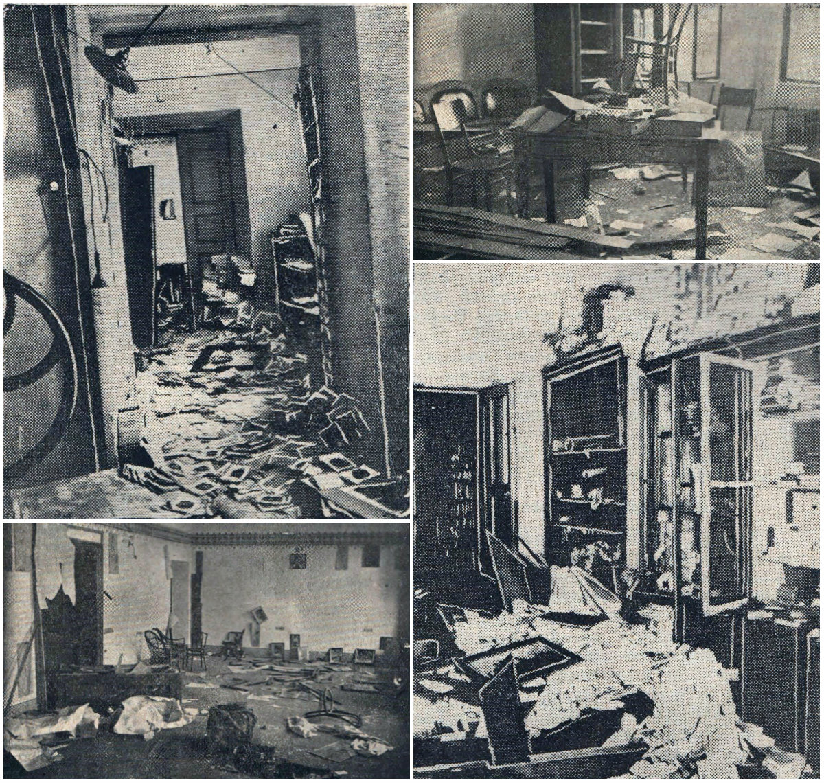 Машини, столи, шафи, тисячі книжок, все це звалене на одну велику стирту, що простягається через три кімнати. Рівночасно гурток хуліганів викидає з вікон цілі оберемки книжок, великі ролі друкарського паперу та докінчує знищення у салі де міститься стереотипія друкарні та нова плоска машина.
