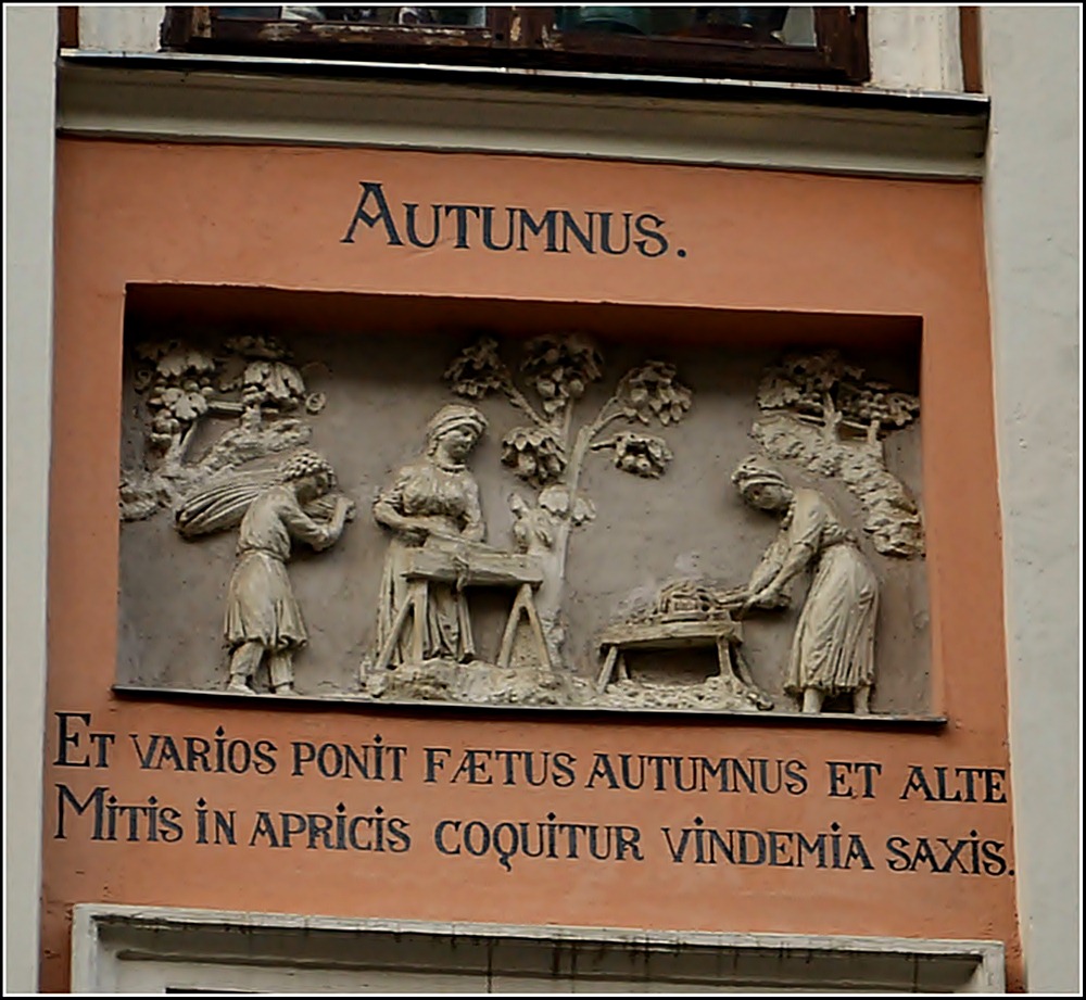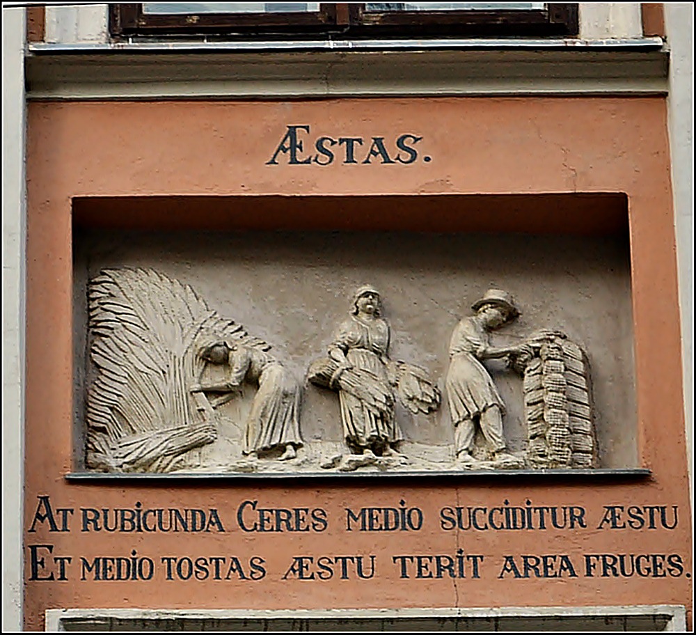 До цієї традиції у житлових та громадських спорудах знову повернулися у ХІХ-му сторіччі, під час чергового піднесення матеріального благополуччя міста. Одним з перших написів такого характеру був девіз на фасаді Вищої технічної школи (Політехніки): «Науками й мистецтвами» [або «Наукам і мистецтвам» – прим. ред]. Значно пізніше, вже у 30-х роках двадцятого сторіччя цей звичай продовжили написом на фасаді Технічної бібліотеки, нав’язуючи до книг: «Тут мертві живуть, а німі говорять». Однак, другим за часом після головного корпусу Політехніки будинком, багато декорованим рельєфами роботи Г. Красуцького та латинськими написами, був широковідомий у Львові дім «Пір року» по вулиці Вірменській № 23. Поміж вікнами другого й третього поверхів знаходяться п’ять рельєфів, чотири з яких алегорично відображають пори року, а центральний – римського бога посівів Сатурна, з іменем якого пов’язані уявлення про «золотий вік». Над цим рельєфом вміщено слова «Золотий Сатурн проводив своє життя на землі» з Вергілієвої поеми «Георгіки». Цитати з цієї поеми поміщені й поряд зі сценами праці в різних порах року. Крайній зліва рельєф має напис «Весна», а під ним: «То ж не барися: ниву масну – щойно рік поведе свої місяці перші хай переорюють дужі воли». Наступний рельєф «Літо» супроводжується словами «8 спеку треба стинати хліба золотії, в спеку зерно молотити сухе на току». Сцену осіннього виноробства доповнюють слова «Осінь барвисті дарує плоди. Обігріті на сонці схили, куди не поглянь, соковитим ряхтять виноградом». І, нарешті, «Зиму» характеризують слова «В холоди землероби живуть урожаєм, й весело бенкетують поміж собою». Поміж третім й четвертим поверхами знаходяться рельєфні зображення знаків зодіаку з числами місяців, у які вступає в силу дія того чи іншого знаку. Суттєвим доповненням цілої картини є горельєфні зображення двох журавлів на рівні вікон четвертого поверху, біля лівого з яких написано «Провіщує весну», а з протилежного боку – «Повертає зиму».