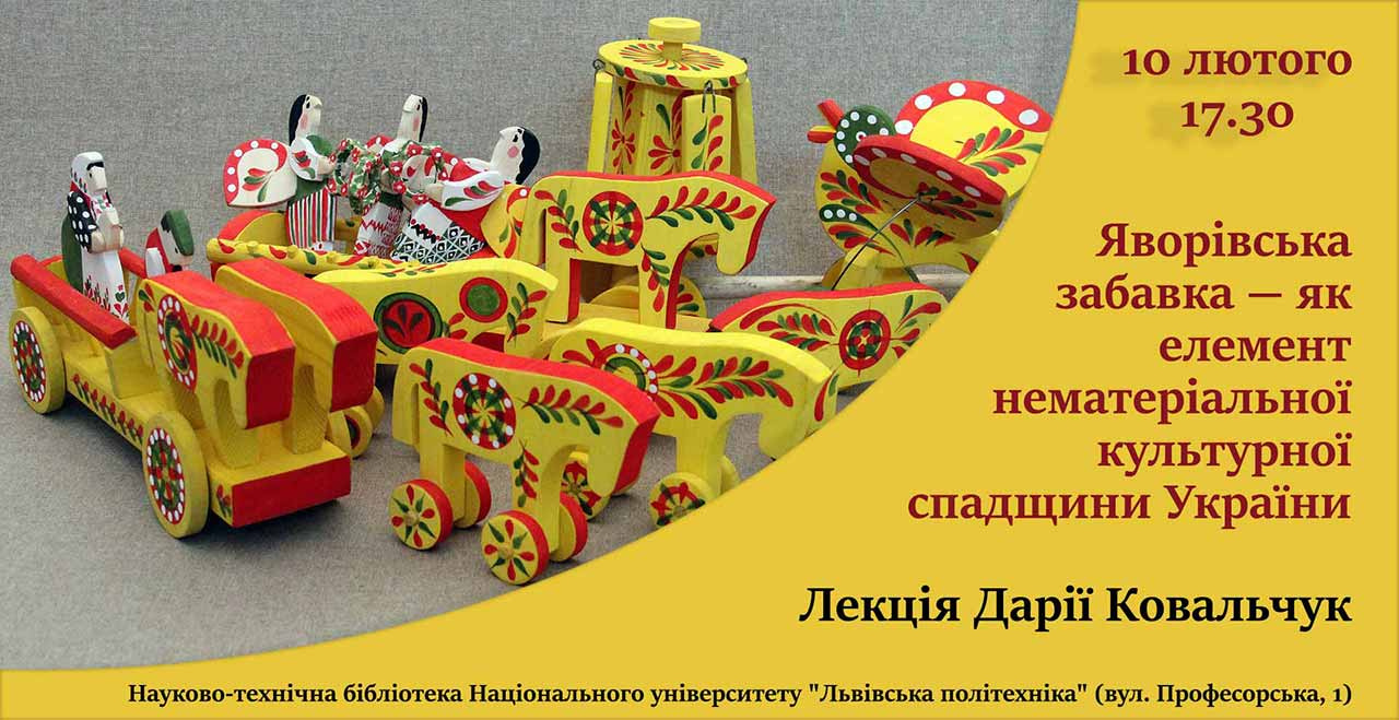 У п’ятницю, 10 лютого 2023 року, о 17.30 в читальній залі Науково-технічної бібліотеки НУ “Львівська політехніка” ( вул. Професорська, 1) членкиня Наукового товариства імені Шевченка, членкиня Національної спілки кобзарів України Дарія Ковальчук прочитає лекцію на тему: “Яворівська забавка — як елемент нематеріальної культурної спадщини України”.