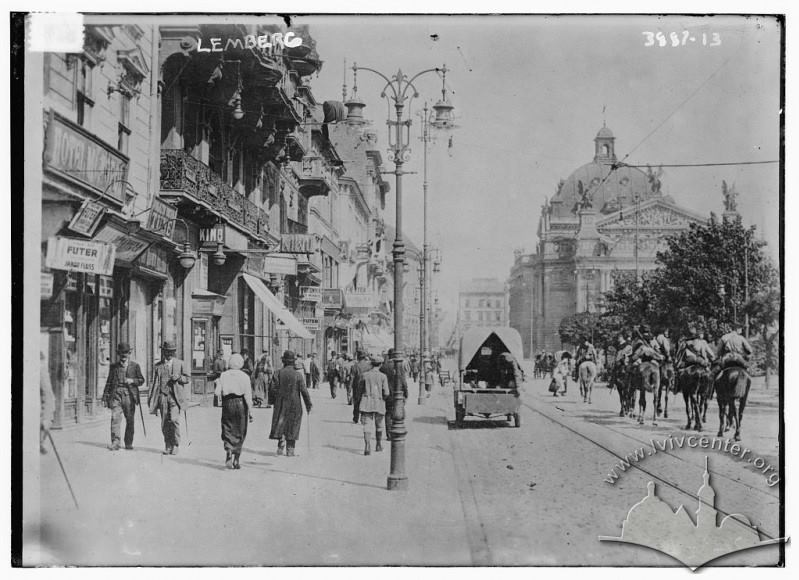 Ще за тиждень до приходу росіян, тобто в останні дні серпня минулого року [тобто 1914], Львів кілька разів зворохоблювала фатальна новина: “Москалі йдуть!” Розігрувалися неймовірні сцени, серед людей панував великий переполох, у місті зчинявся небувалий рух, повози, наладовані людьми і клунками, курсували у керунку головного двірця. Можна було побачити навіть представників найвищих суспільних верств на вантажних автах (т. зв. Streifwagen), верхи на своїх куфрах і вузлах, що чимдуж поспішали на двірець.