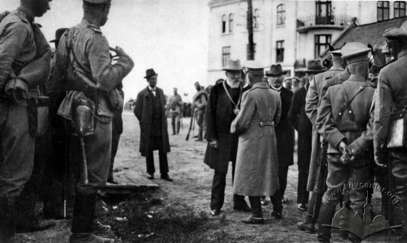 Війська увійшли під звуки музики, без пострілів. Скрізь зарябіли розмаїті мундири, такі для нас чужі, вулиці загатили незліченні фіри. Вражені мешканці з недовірою приглядалися до цієї навали.