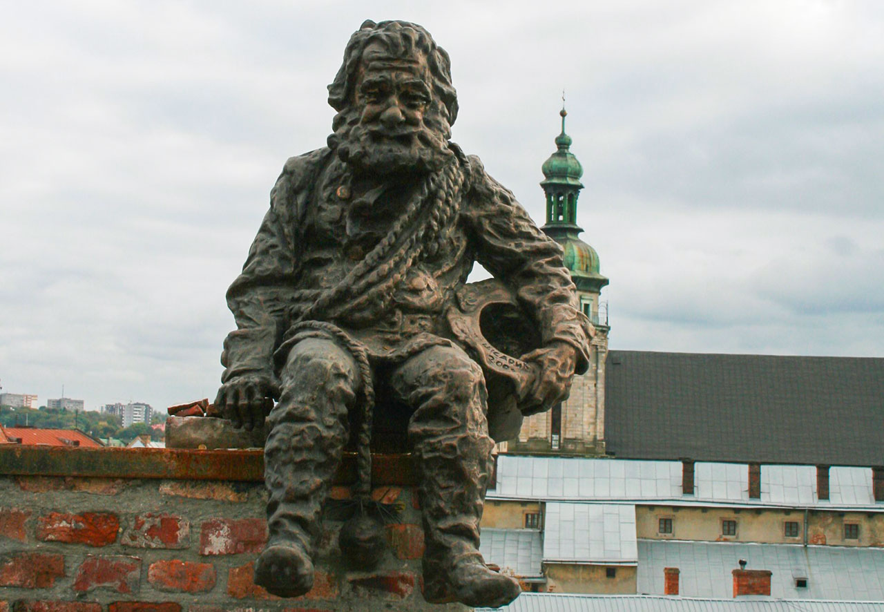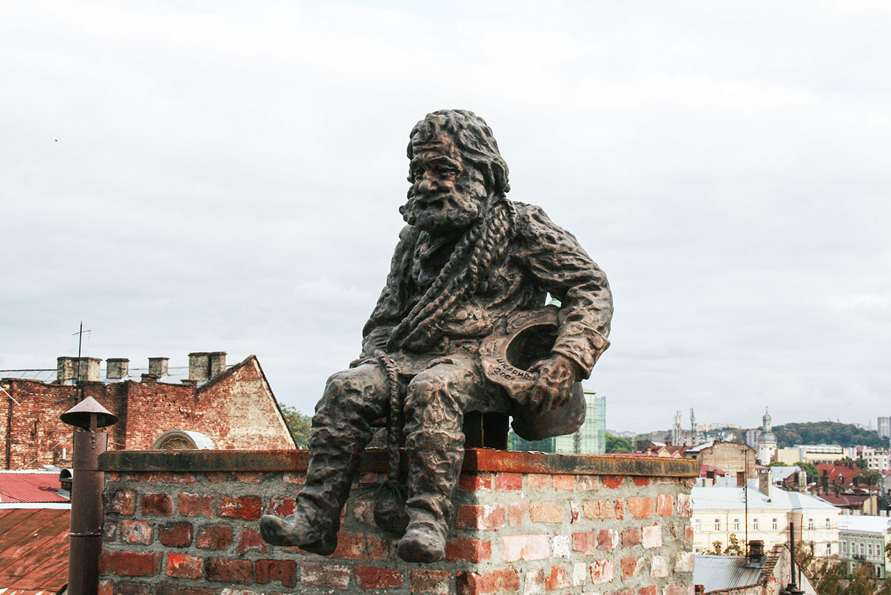 А от ще один витвір скульптора, пам’ятник Сажотрусу, що знаходиться на даху однієї з кам’яниць у центральній частині міста, пережив низку кардинальних змін під час свого створення. Так, фігура сажотруса, яка зараз є старцем з бородою, спочатку задумувалася молодим хлопцем. «Протягом роботи було багато обговерень із замовниками, – пояснює Володимир, – в решті решт, вирішили так. І, вважаю, правильно».