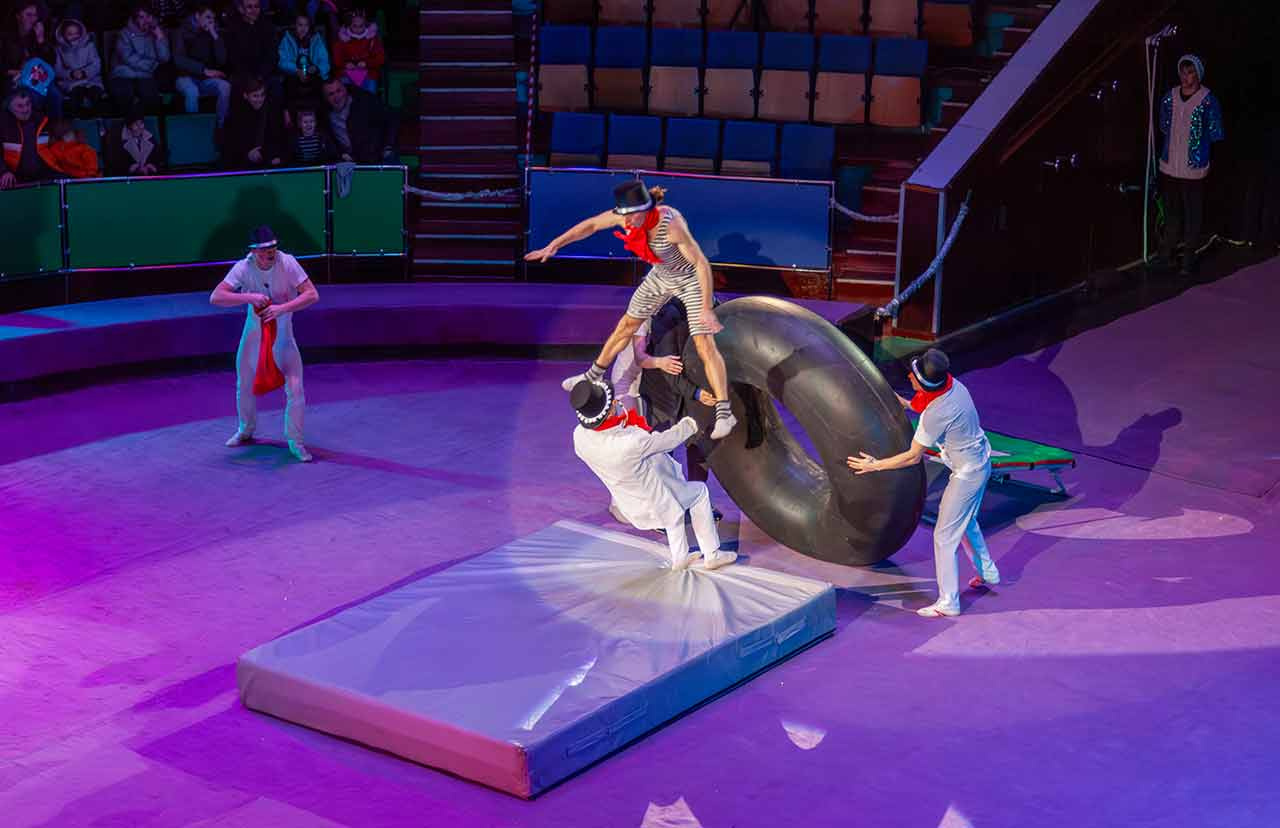 Розпочинають першу частину циркової програми комічні акробати на балонах під керівництвом Артура Юшковського. З першої секунди ти занурюєшся в атмосферу пустощів, жартів і видимої легкості виконання акробатичних трюків.
