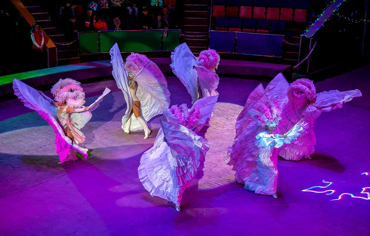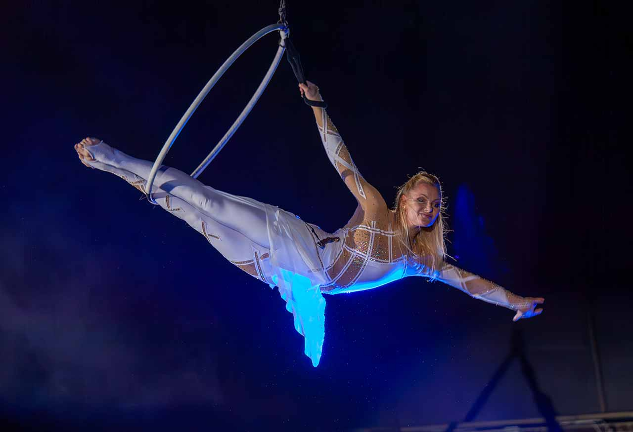 Виступ з повітряним кільцем артистки Тетяни Чернової — це захоплива гра з простором та гнучкістю. Тетяна літаючи в повітрі, створює естетичне шоу, обрамлене витонченою хореографією та елементами акробатики. Її виступ на кільці — це поєднання гнучкості та сили, що створює вражаючі образи та надзвичайні перетворення в повітрі. Цей виступ залишає глядачів зачарованими красою та грацією, які об’єднуються в мистецтві повітряної акробатики.