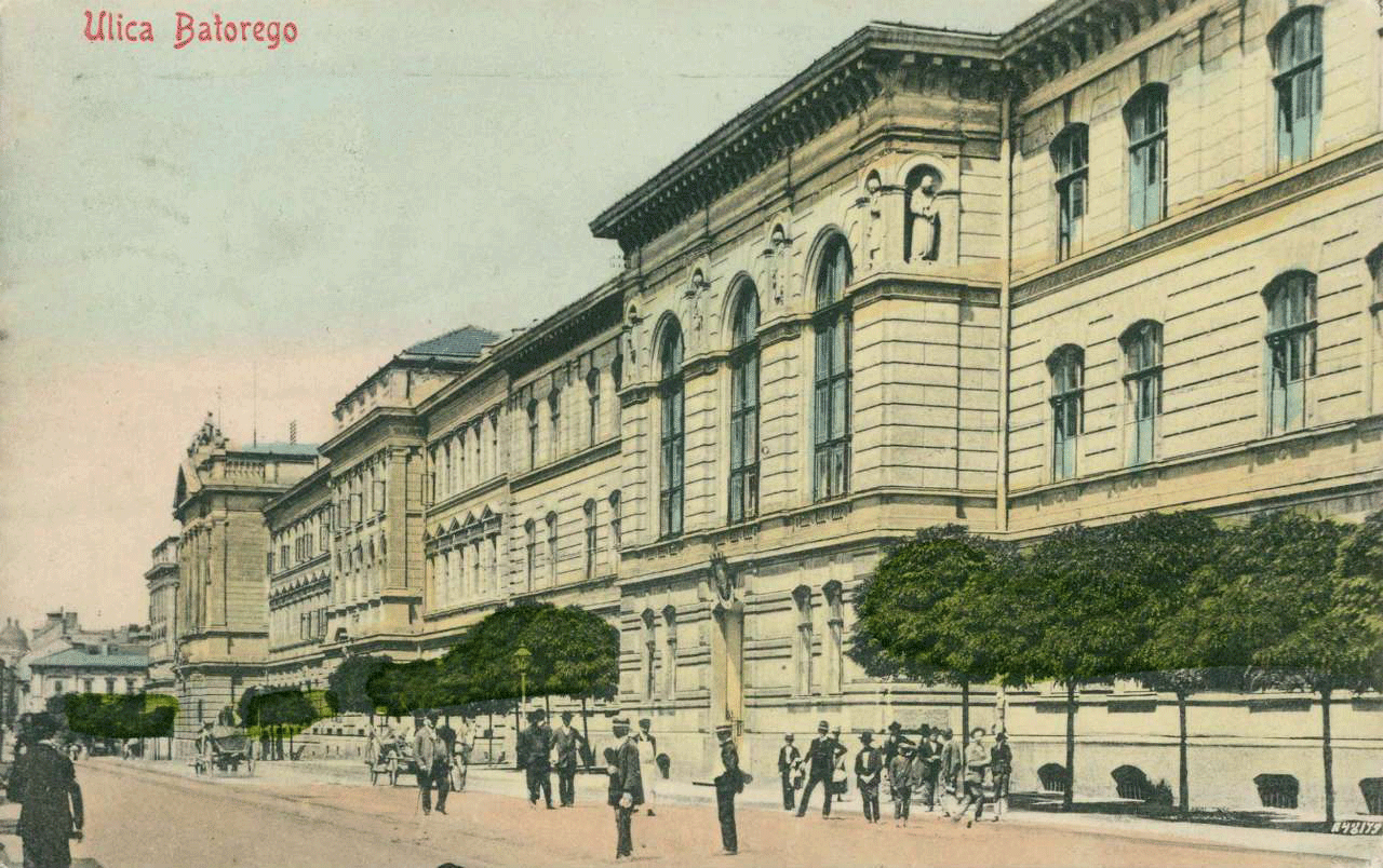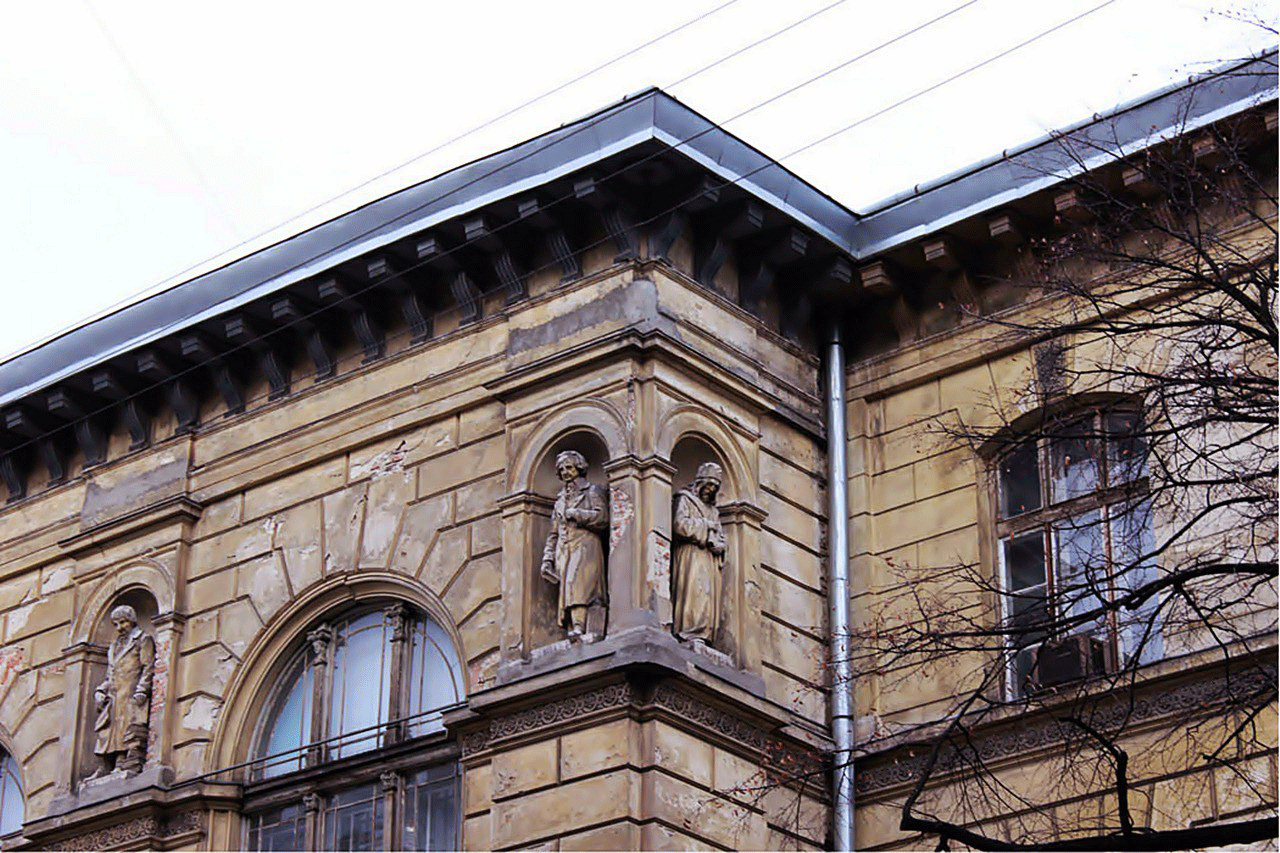 Скульптури на фасаді гімназії ім. Франца Йосифа I на вул. Баторія 5, нинішній Князя Романа (1876).