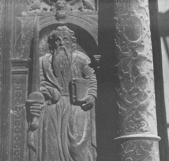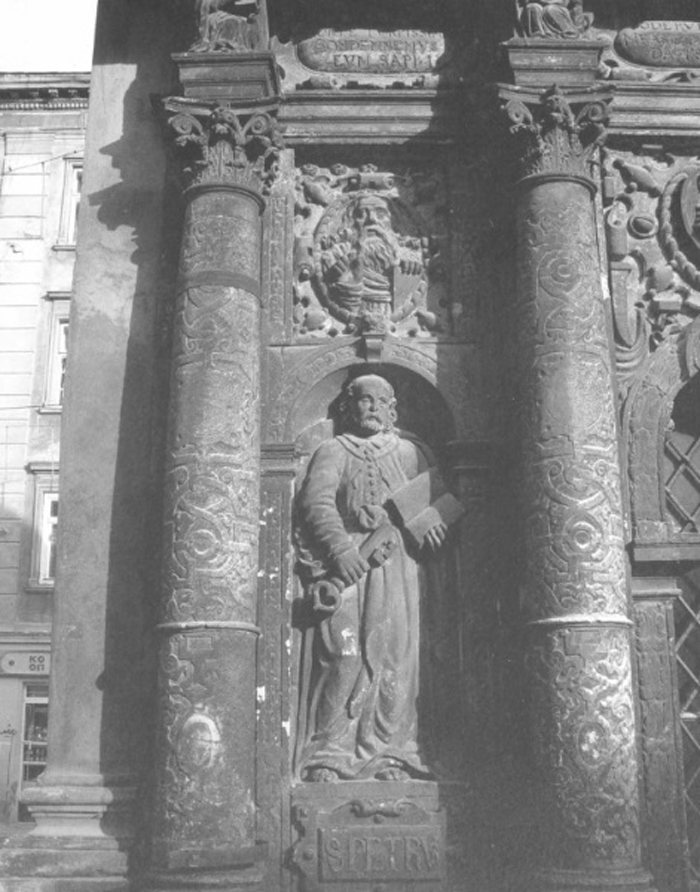 На фасаді ми бачимо Св. Петра, а над ним напис: “Morte turpissima condemnemus/ eum sapi I” – “Засудімо його на смерть ганебну” (Кн. Мудрості 2.20).