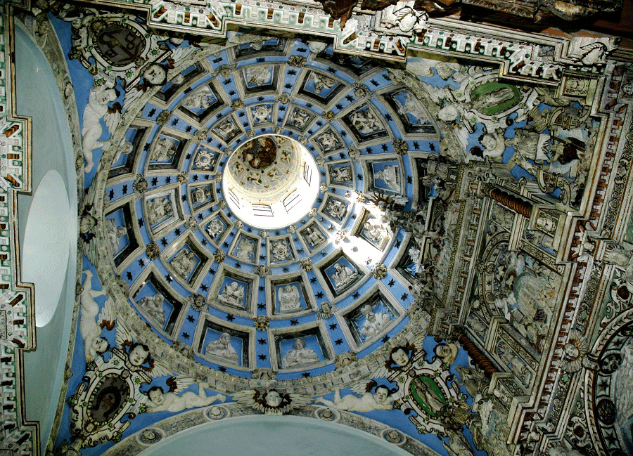 У заглибленнях куполу п’ятеро ангелів тримають частини фрази з Одкровення Іоана Богослова: “Sanctus sanctus sanctus Dominus Deus” – “Свят, свят, свят Господь Бог”.