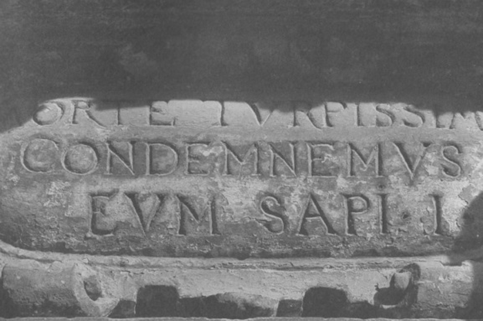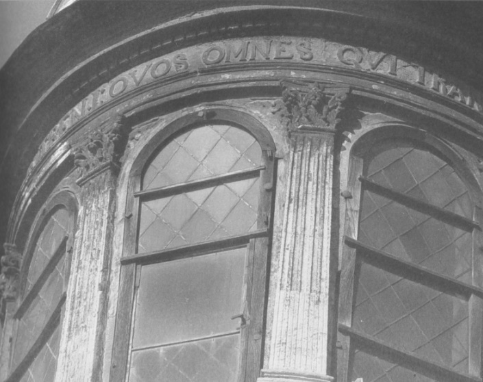 Над входом розміщено написи “Et appenderunt mercedem meam XXX argenteos /Zach XI” – “І вони мою платню відважили тридцять срібняків” (Захарії 11.12). “In Virga percutien[t] maxillam ivdicis /Mich. V.” – “Тростиною б’ють по щоці суддю (Міхея 4.14)”.