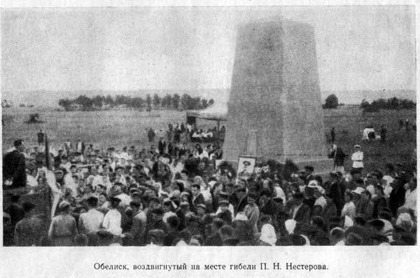 Однак, повернемося до згаданого вище монументу. Одразу після загибелі Нестерова, на місці краху його літака було насипано великий курган та споруджено хрест. В радянську атеїстичну епоху хрест на могилі пілота, якого встигли перетворити з російського на радянського героя, ясна річ, що сприймався недоречним. Тому в 1947 році на його місці було закладено обеліск, який відкрито аж в 1952 році.