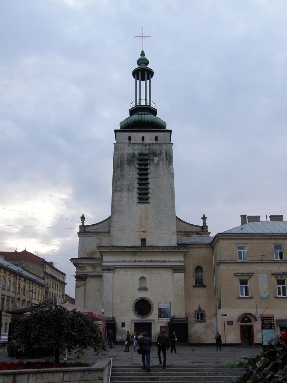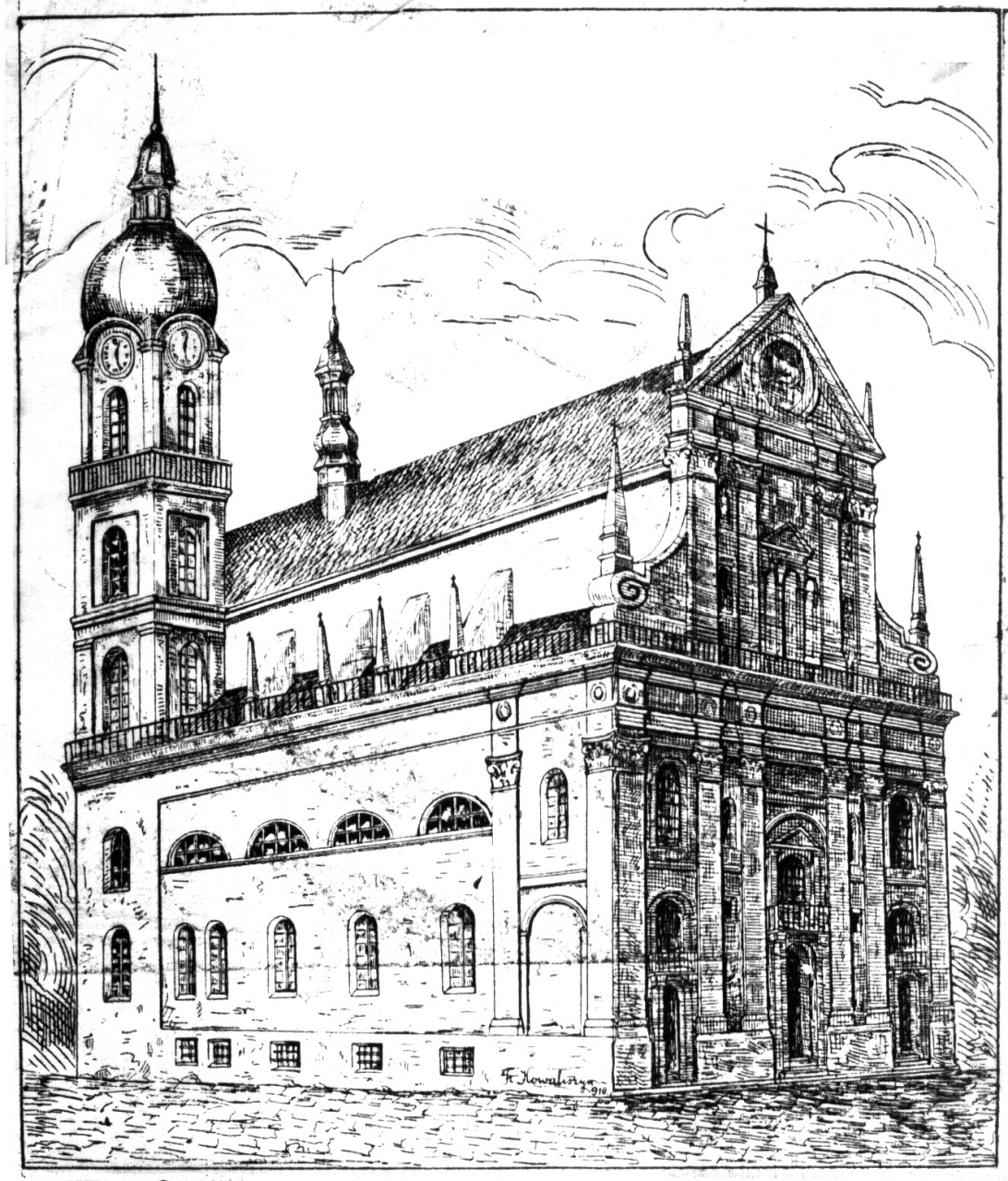 Однією з найдавніших метаморфоз, яку ми маємо можливість спостерігати завдяки численним літографіям є видозміна костелу Єзуїтів. Мабуть, хтось і здивується, адже за більш як за 150-літню історію фотографій, на котрих присутній цей костел, він не змінював свого вигляду. Але ще на початку XIX ст. храм мав дещо інший вигляд. Річ у тім, що ще в 1702 році з південної сторони апсиди було споруджено чотиригранну вежу, яка на той час стала найвищою у місті. Однак, 1826 року усіх львів’ян шокувало падіння вежі Львівської ратуші. Під впливом цієї події в 1830-му році було розібрано вежу костелу Єзуїтів, стан котрої був не кращий, а ніж вежі, що завалилась. Однак залишки цієї вежі на костелі Єзуїтів можна спостерігати і сьогодні, оскільки розібрано її було тільки до рівня верхівки самого храму.