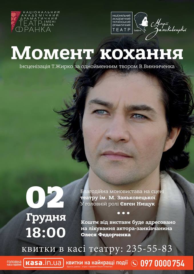 В неділю, 2 грудня 2018, в Театрі імені Марії Заньковецької відбудеться благодійна моновистава “Момент кохання”, де головну роль зіграє чинний міністр культури Євген Нищук. Всі кошти від продажу квитків передадуть на лікування актора-заньківчанина Олеся Федорченка.