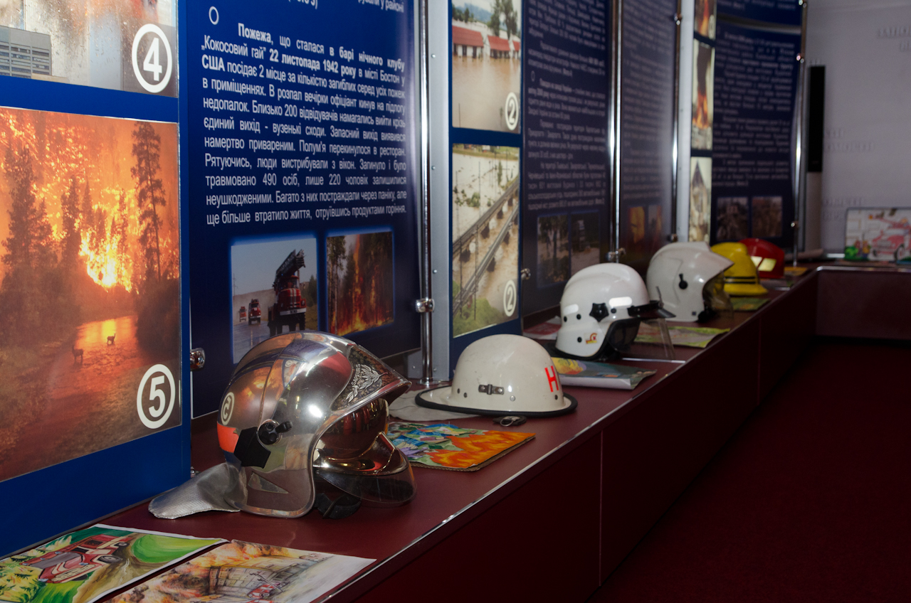 У залі пожежно-технічного оснащення розміщені сучасні костюми пожежників, каски, піноутворювачі, схема протипожежної безпеки області, наслідки використання неякісних побутових приладів, фрагменти знайдених військових снарядів та багато іншого.