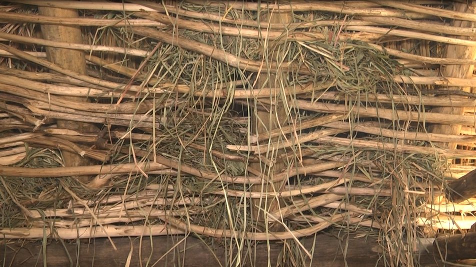 “Закладалися колоди, вони всі є криві, адже це — підручний матеріал. Це не калібрований брус. Складав все, що ти мав, а за колодами забивав глиною і робив гідроізоляцію. По даху кладуться крокви і як варіант – це плетений такий дах. А на нього покладений перев’язаний очерет”, — розповідає про будівництво хати Ярема Іванців.
