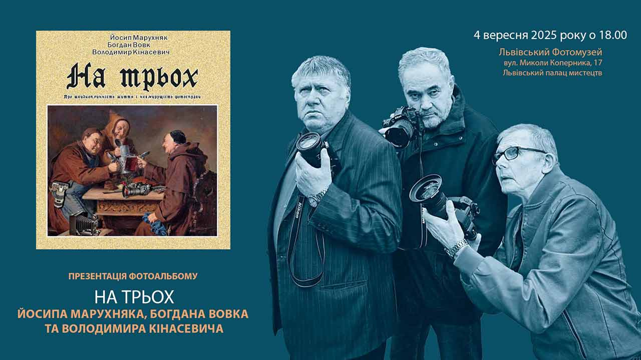 В четвер, 4 вересня 2025 року, о 18.00 у Львівському Фотомузеї (Львівський палац мистецтв, вул. Коперника, 17) відбудеться презентація фотоальбому “На трьох” Йосипа Марухняка, Богдана Вовка та Володимира Кінасевича.