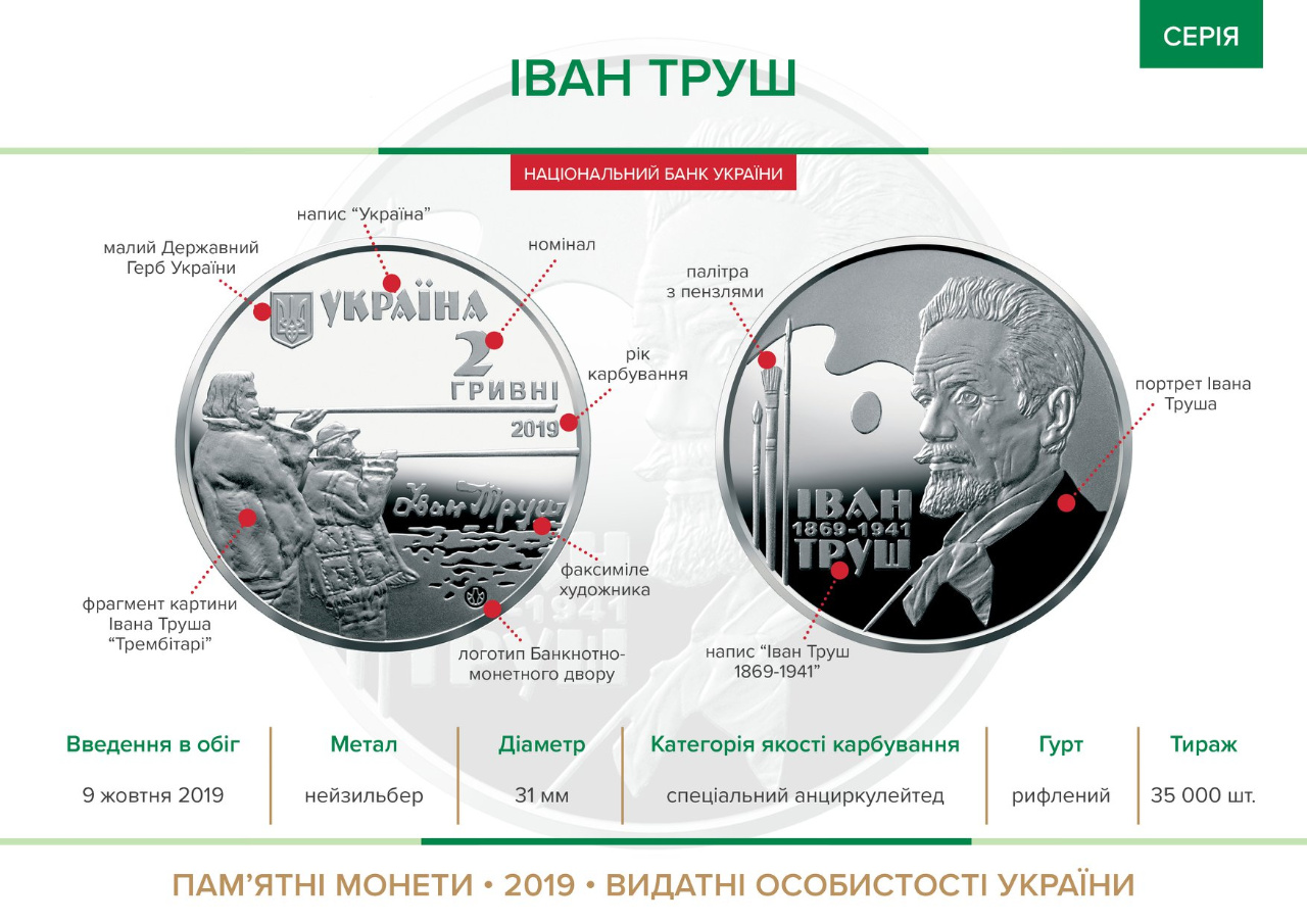 9 жовтня 2019 року Національний банк, продовжуючи серію “Видатні особистості України”, ввів в обіг пам’ятну монету “Іван Труш” номіналом 2 гривні. Монета присвячена Івану Трушу (1869-1941) – художнику, мистецтвознавцю, літературному і художньому критику та видавцю.