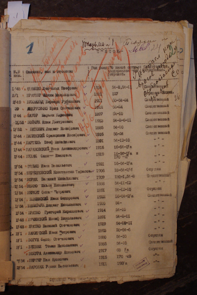 Перша сторінка «першого» розстрільного списку в’язниці № 1 у м. Львові (тюрма на Лонцького). Чітко видно написи на документі – винесення вироку начальником в’язниці № 2 (Замарстинівська) по Львівській області Шевченком (напис зеленим чорнилом: «Расстрелять, как врагов народа») та накладання санкції до виконання вироку прокурором Львівської області Харитоновим (напис чорним чорнилом: «Расстрел врагов народа санкционирую»). Двоє осіб вирішили долю тисяч…