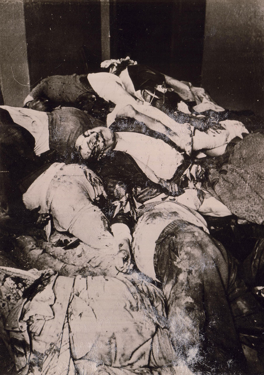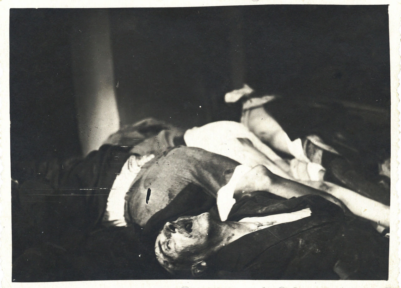 Трупи розстріляних в’язнів у камерах в’язниці на Лонцького. м. Львів, 1 липня 1941 р. Деякі такі камери німцям довелося замурувати, щоб уникнути епідемії. Повторну ексгумацію провели в лютому 1942 р. коли вдарили морози.