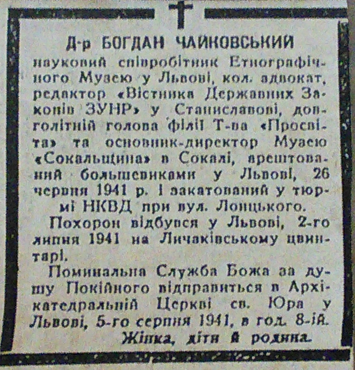 Некролог про загибель та похорон Богдана Чайковського (відомий громадсько-політичний діяч, юрист, син письменника Андрія Чайковського) надрукований у львівській газеті «Щоденні вісті». За родинними переказами тіло Б. Чайковського впізнала служниця за одягом, який прасувала йому в день арешту.