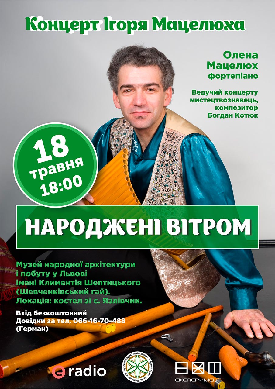 В п’ятницю, 18 травня 2018 року о 18 годині на території Музею народної архітектури і побуту імені Климентія Шептицького (Шевченківський гай) молодіжний рух Експеримент запрошує концерт Ігоря Мацелюха “Народжені вітром”. На фортепіано акомпануватиме Олена Мацелюх.