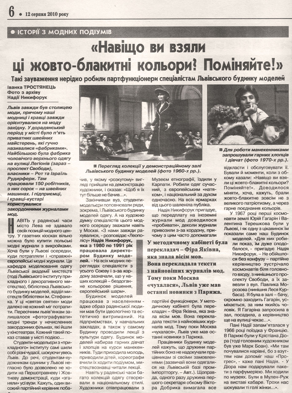 Працівники Будинку моделей кажуть, що дружини партійних бонз не надокучали працівникам зі своїми замовленнями (зазвичай вони одягалися на Львівській базі промімпортторгу. – Авт.). Щоправда, одного разу дружина першого секретаря обкому Віктора Добрика вимагала все відкласти і обслуговувати її. Бували й моменти, коли з обкому казали: “Навіщо ви взяли ці жовто-блакитні кольори? Поміняйте!”. Доводилося міняти, хоча, кажуть, брали жовто-блакитне зовсім не з великого патріотизму, а через гарне поєднання кольорів.