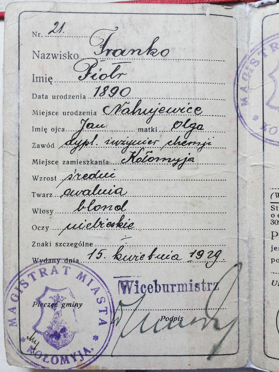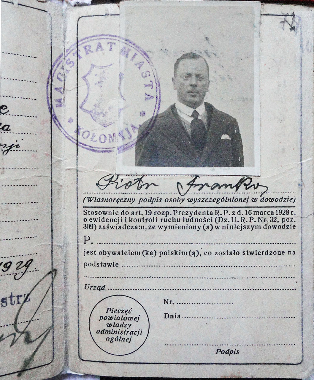 Посвідчення особи, видане 15 квітня 1929 р. у Коломиї, давало можливість Петрові Франкові користуватися всіма правами громадянина Польщі.