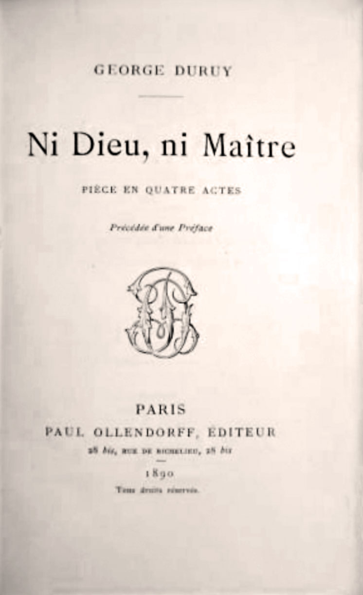 Автор драми був сином відомого французького історика та державного діяча Віктора Дюруї (1811–1894). Перш ніж передати зміст рецензії, прагнемо пояснити значення та зміст назви літературного твору. «Ні Бога, ні пана» («Ni Dieu, ni maître») — нині це девіз анархістів, однак обмежитися цим було б замало. У час написання драми під такою назвою це гасло тільки розпочинало у Франції свою історію. Його виникнення пов’язують із діяльністю Луї Оґюста Бланкі (1805–1881), відомого французького революціонера та комуніста-утопіста. Незадовго до своєї смерті, 1880 року, він засновує у Парижі часопис з однойменною назвою, який проіснував до 1885 року. Основною тематикою видання було поширення лівих ідей та утвердження матеріалізму й атеїзму у французькому суспільстві. Після смерті Бланкі його однодумці продовжували започатковану ним діяльність, навколо якої постала політична теорія та практика революційного руху, відома історикам як «бланкізм». Ідея швидкого державного перевороту, зміцнення влади диктаторськими методами, повалення буржуазного ладу тощо — усе справило великий вплив на пізніший більшовицький рух і мало наслідок в історії народів усього світу. Однак, 1890 року, коли була опублікована драма під цією назвою, вплив однойменного гасла й бланкістів здавався нереальною фантастикою.