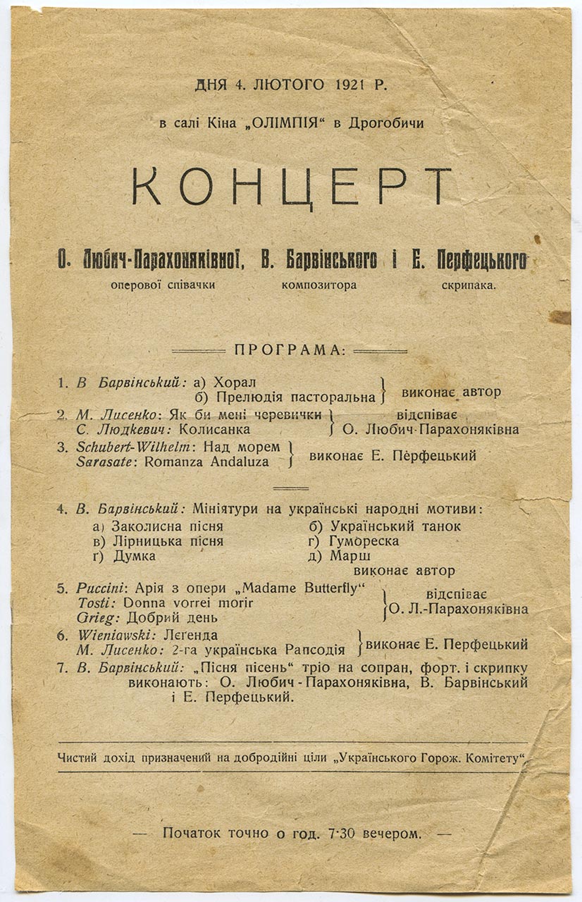 Ось рядки з відгуку на концерт за участю Олександри Парахоняк, Василя Барвінського та Євгена Перфецького, в якому серед інших прозвучали нові твори Людкевича і Барвінського (жовтень 1920 р.): “Голос співачки трохи навіть скріпився, іменно ж у середині, зрештою, всі гарні прикмети голосу, дикції і техніки остали в повній силі і виявилися особливо в другій половині арій й у піснях Чайковського і Ґріґа. Хіба якоюсь тремою треба пояснити легку дрож голосу з початку виступу і хвилеве стемнення гарного, з природи ясного тембру, яке опісля зникало без сліду”.