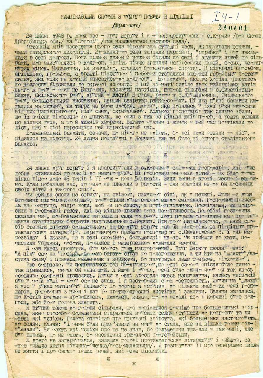 Ми обидва спали на стриху, на свіжому, пахучому сіні, як у перині. Були ми дуже втомлені цілонічним маршем, тому спали дуже смачно аж до снідання. Господиня принесла нам мидницю [велика миска для господарських потреб], відро води, щоб ми помились, а потім сніданок. Поснідавши, ми попросили в господині газет, які за кілька хвилин вона нам принесла. По обіді господиня сказала нам, що большевики виїхала з села до р-ну. Тоді почала оповідати нам про знущання сталінських бандитів над селянами с. Корчина. При тому питалася нас, в який спосіб ставити спротив большевикам. На це друг Беркут дав їй відповідь та підпільну протиколгоспну літературу. Передвечором прийшов господар зі с. Синевідсько В[ижнє] і дав нам розвідку і сказав, що в селі спокійно, большевиків немає. Ми прийшли до хати, почистили убрання [одяг], чоботи, помилися і нетерпеливо дожидали вечора.