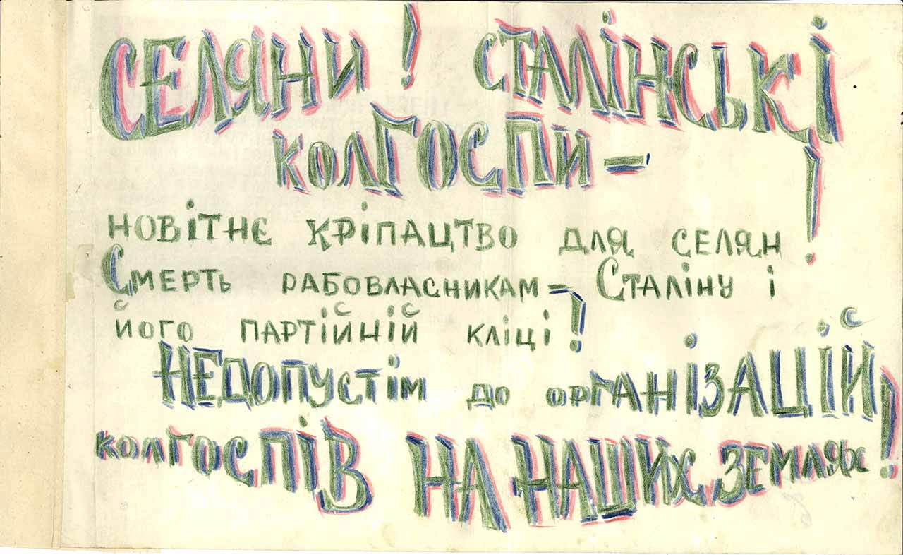 Я вступив також до голови сільради, щоб довідатися точніше про большевицькі звірства, яким способом большевики стараються змусити селян вступати до колгоспу та чи мають які успіхи. Голова оповідав [розповідав] про нечувані звірства, які большевики застосовують до селян. Казав: “І мене були прив’язали за ногу до стола, але за кілька годин відв’язали”. Чи мають які успіхи про це не знаю, бо большевики [це] тримали в таємниці, але був певний, що не мають, бо населення трималося по-геройськи.