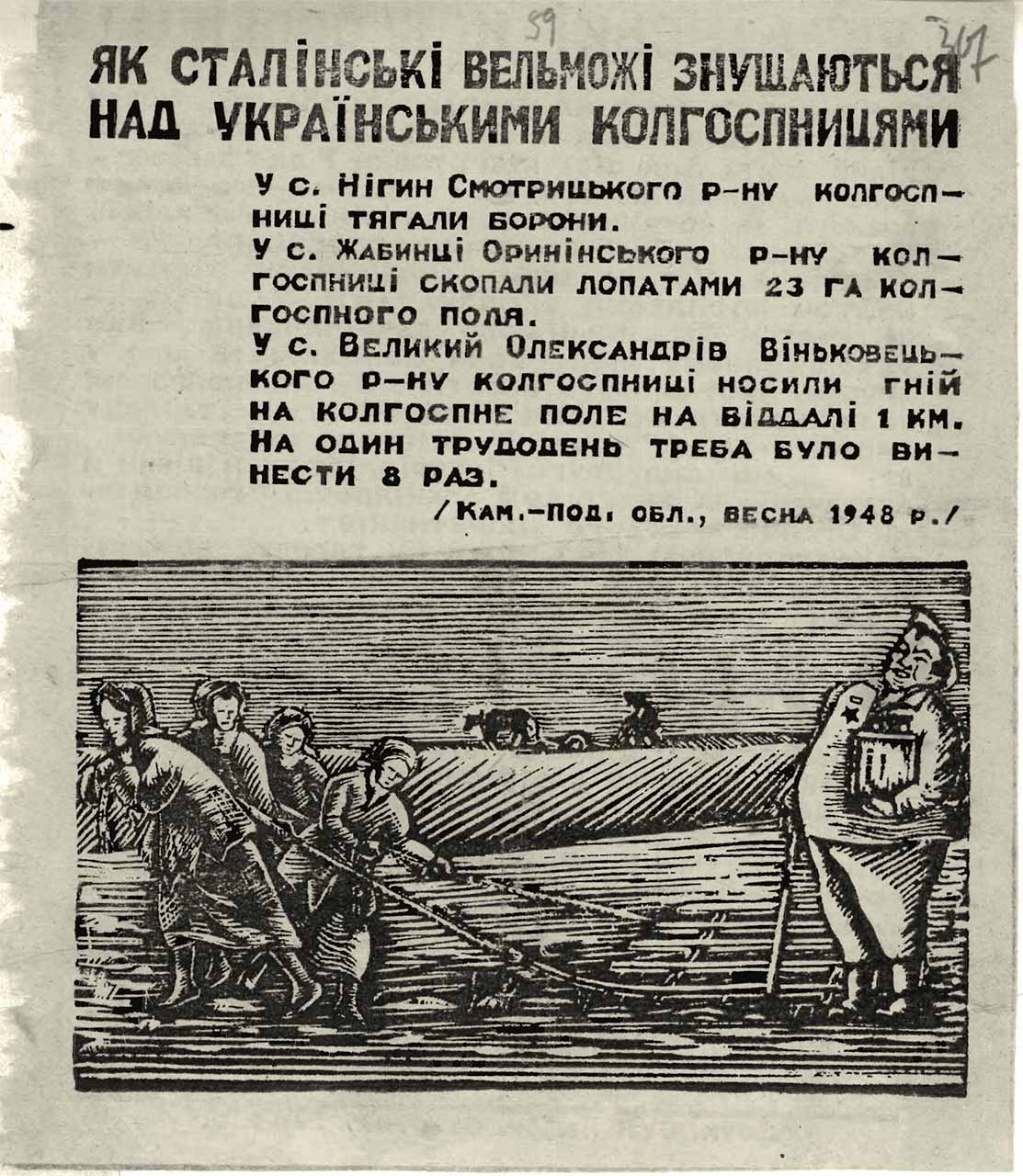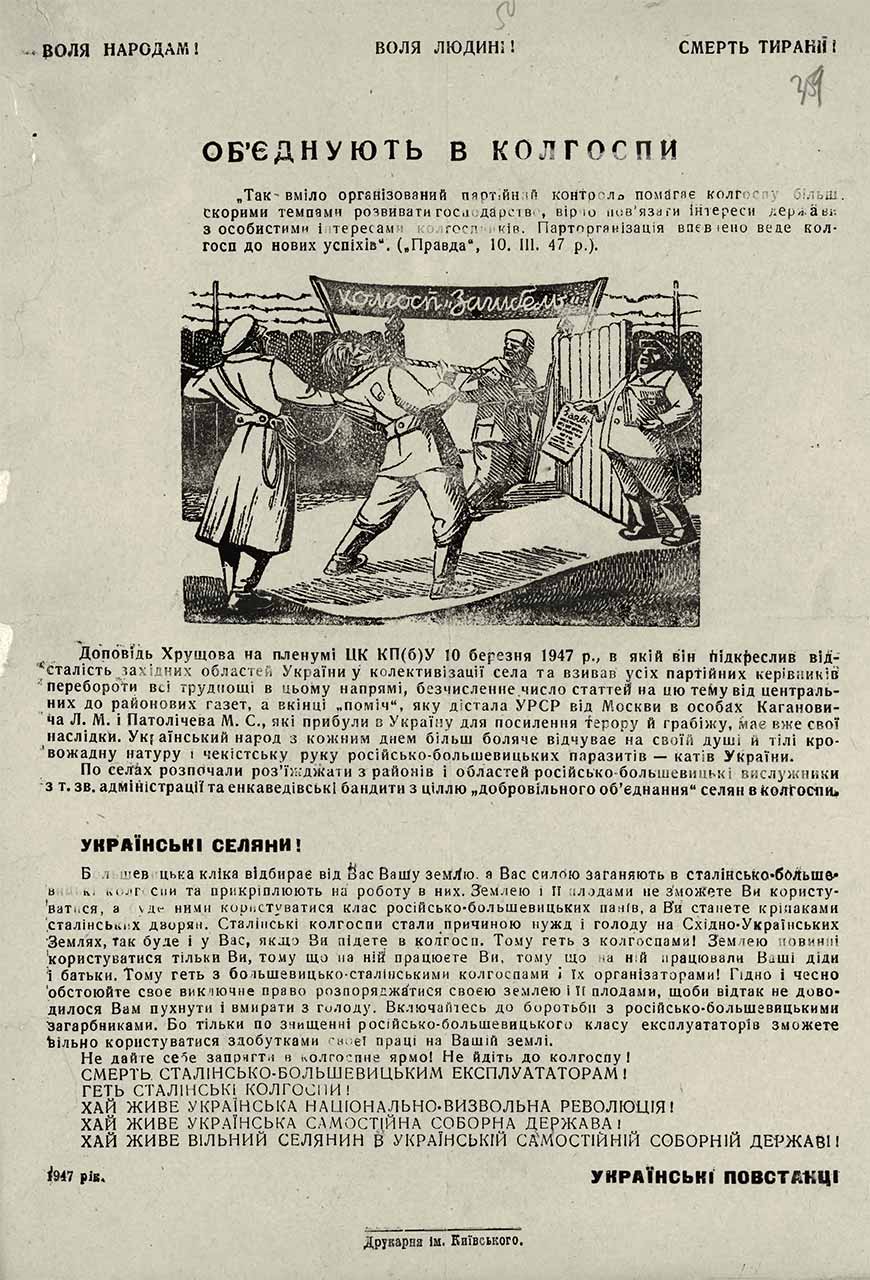 Форсування суцільної колективізації (примусова система заходів, яка спрямована на перетворення одноосібних селянських господарств у великі колективні й радянські господарства (колгоспи і радгоспи) в західних областях України розпочалося із середини 1947 р. В той час на Україні склалося тяжке становище. Республіка була знесилена зимовим голодом 1946–1947 pp. У Галичині, де такого не спостерігалося, з’явилися люди, які прибували із східних областей у пошуках харчів. Кращих “агітаторів” проти колгоспного ладу годі було б шукати. Західноукраїнські селяни наочно переконалися, чим для них може обернутися колективізація.