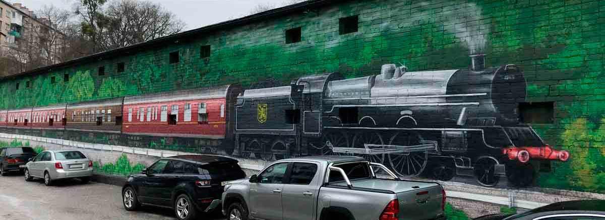 Цікаво, що зовсім неподалік на вул. Ярославенка можна побачити інший потяг, талановито намальований на стіні гаражного кооперативу.