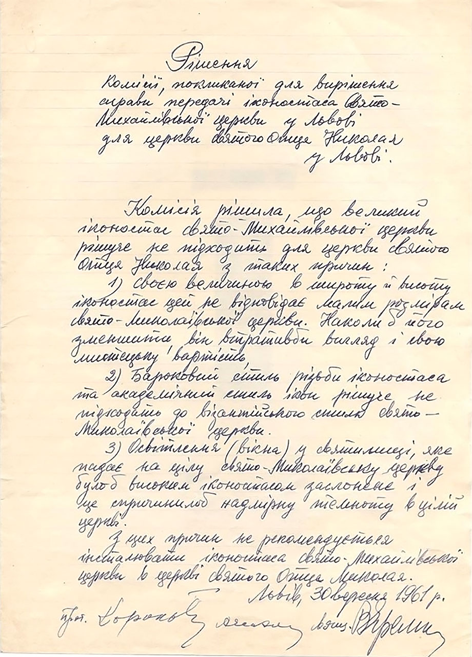 Ухвалення нового статуту РПЦ, який надавав переважне право громаді у прийнятті рішень про статус храму, нівелював значення і роль духовенства, призвело до того, що упродовж 1961-1962 років радянська влада розпочала масований захід проти Православної Церкви. І впродовж цього часу понад 400 парафій у Львівській єпархії перестали існувати. Відтак у 1961 році припинила своє існування і парафія святого Архистратига Михаїла. Збереглися окремі документи, які пов’язані з ліквідацією парафії і з переданням окремих її ікон чи іконостасу до інших храмів. Церква припинила діяти уже як храмова споруда.