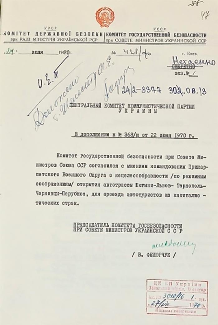 Функції контролю за іноземними туристами здійснював 7-й відділ 2-го Управління КДБ, однак, зважаючи на специфіку роботи, до неї долучались й інші відділи та управління. Методи роботи з іноземними туристами КДБ постійно відточував і вдосконалював. Наприклад, з метою “запобігання ворожої діяльності” окремих іноземних туристів, у Львові впродовж 16–17 лютого 1960 р. відбувався спеціальний семінар керівних та оперативних співробітників двох контррозвідувальних і семи оперативно-технічних відділів КДБ. У центрі уваги зібрання опинилося питання автотуризму. Відомо, що на семінарі озвучувались доповіді 2-го Управління КДБ “Про організацію контррозвідувальної роботи серед іноземців і її особливості на автотрасах” та 7-го відділу КДБ “Про організацію зовнішнього спостереження за іноземцями на автотрасі” [3]. Туристичні подорожі автомобілями додавали органам держбезпеки значно більше роботи, тому перелік доріг, якими могли пересуватися іноземці був обмежений. Наприклад, КДБ у 1970 р. рекомендував не відкривати з режимних міркувань трасу Шегині-Львів-Тернопіль-Чернівці-Парубне для проїзду автотуристів з “капіталістичних країн” [4].
