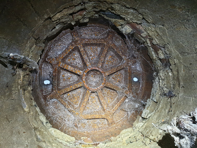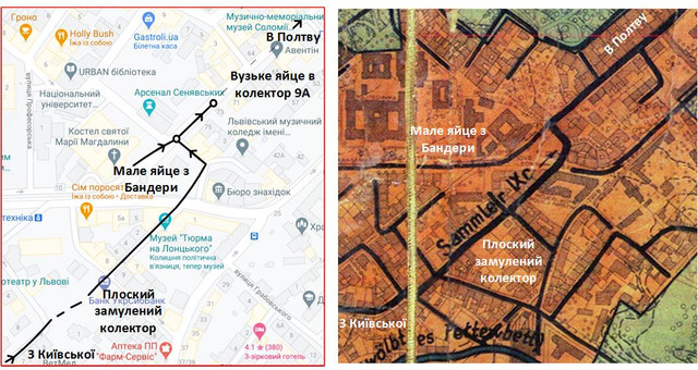 То ж я вирушив великим колектором. Майже одразу він двічі різко повернув праворуч, повторюючи рельєф вулиці. Відносно невисоко над головою були люки. Через один з них я побачив кут будинку на вул. Степана Бандери 6.