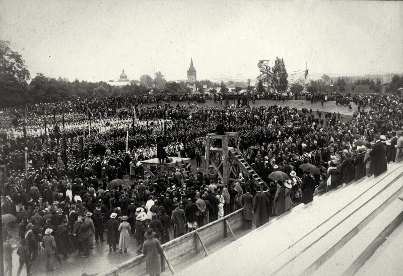 Показові вправи соколів, попри дощову погоду, розпочалися о 16 год на площі «Сокола-Батька». Керував усією програмою Іван Дигдалевич. Були показані такі вправи: вільноруч (керівник Іван Савчинський з Романівки) – 344 особи; палицями (керівник Омелян Гузар зі Львова) – 146 осіб; хоруговцями (керівник Марія Сумик з Олеська) – 93 особи; ручниками (керівник Олена Степанівна) – 145 сокілок зі Львова. Жіночі відділи виконали лише по три вправи, з огляду на погану погоду та вечірній час дня. Забракло часу для народних вправ, вправ на приладах, пожежних вправ, ігор і забав, бігу, веж. Закінчився захід співом українського національного гімну «Ще не вмерла Україна».