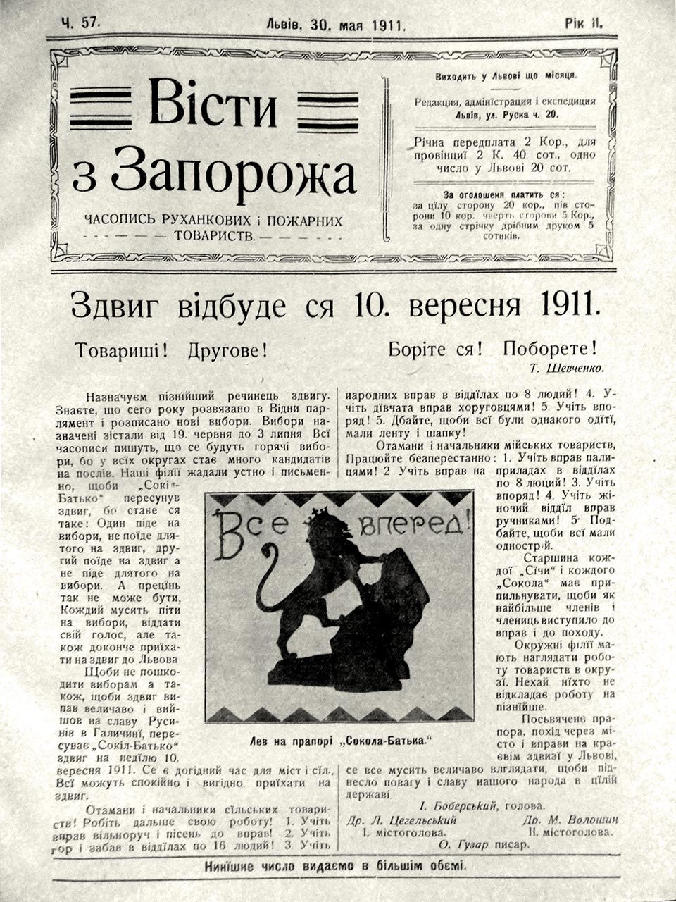 Інформацію про І Краєвий здвиг у Львові помістили українські, польські, чеські, жидівські, німецькі і російські часописи, зокрема «Вісти з Запорожа» (Львів), «Діло» (Львів), «Народне Слово» (Львів), «Канадийский Фармер» (Вінніпег), «Свобода» (Львів), «Галичанинъ» (Львів),»Słowo Polskie» (Львів), «Kurjer Lwowski» (Львів), «Свобода» (Нью–Йорк), «Дніпрові Хвилі» (Катеринослав), «Русское Слово» (Львів), «Wiek Nowy» (Львів), «Утро Россіи» (Москва, стаття Дмитра Донцова), «Nowa Reforma» (Краків) та ін. З нагоди посвячення прапора «Сокола-Батька» за власні кошти наприкінці 1911 р. Іван Боберський випустив листівку із зображенням одного боку прапора з Левом.
