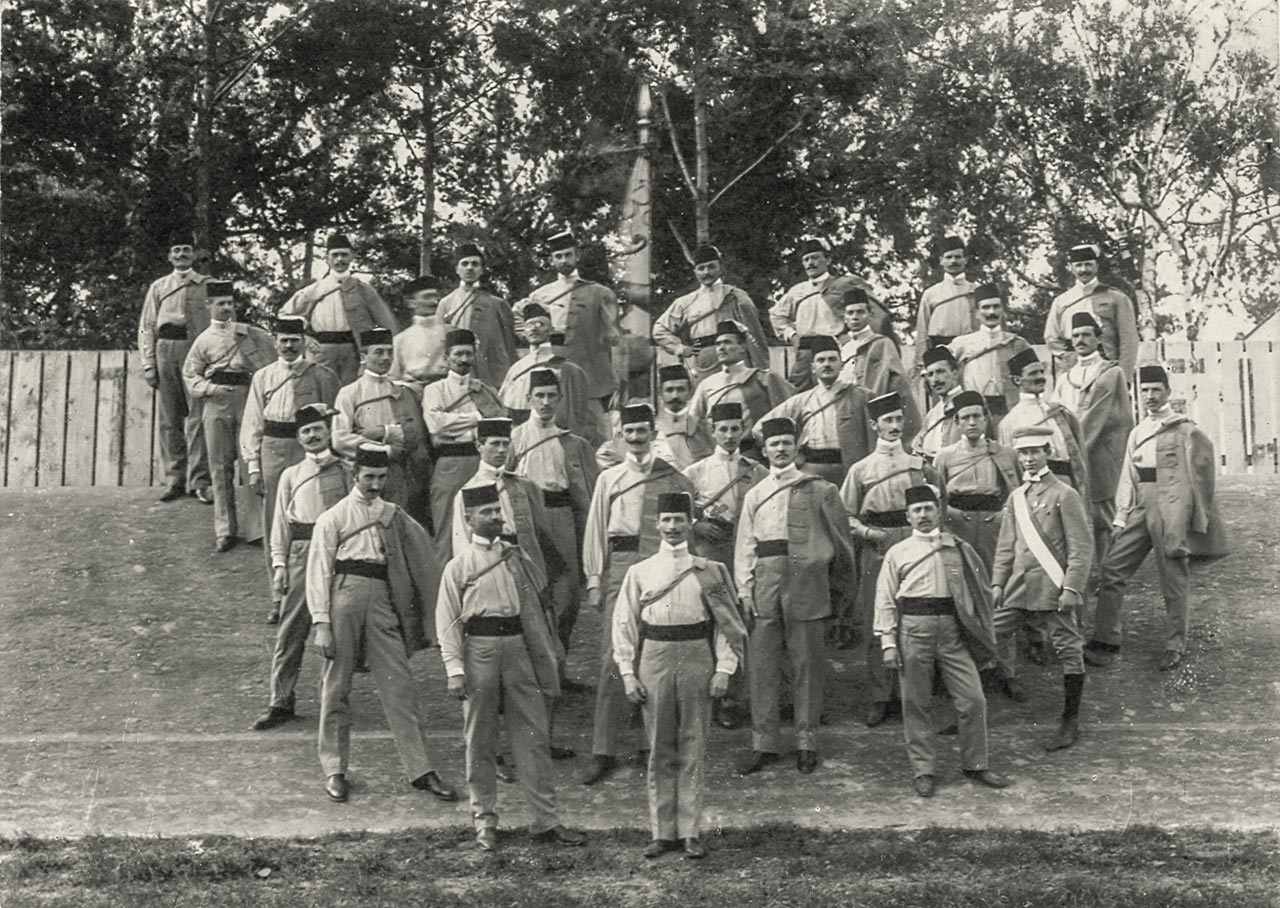 - Малинова стрічка перегнута наполовину, зверху зав’язана на бант. На стрічці гаптований напис: на одній половині – «Здобути або дома не бути!», на другій – «Від ґімн. тов. «СЇЧ» в Чернівцях» (Від гімнастичного товариства «Січ» в Чернівцях). На краю металеві тороки (довжина стрічки 220 см).