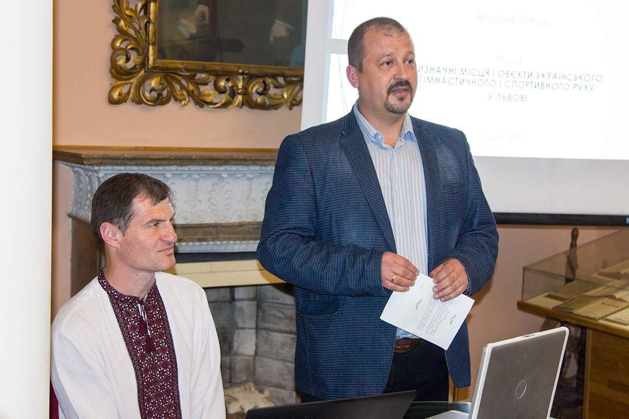 Кандидат наук з фізичного виховання та спорту Львівського ДУФК ім.Івана Брберського Ярослав Тимчак у своєму виступі окреслив історичні місця та об’єкти українського гімнастичного і спортивного руху у Львові, які для кожного українця повинні стати наріжним каменем.