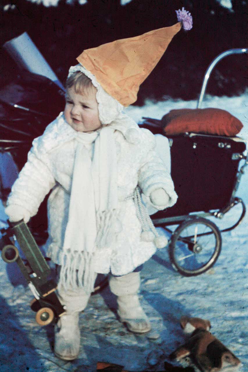 В останніх роках перед війною відкрилися нові можливості перед нашим фотографом – колір у фотографії. На одній із перших прозірок батько мій сфотографував свою маленьку тоді доню так одягнену: в білому плащику (була зима), в жовтій шапці і з червоною подушкою, щоб переконатися як виходять кольори. Знимка була знаменита і є до сьогодні!