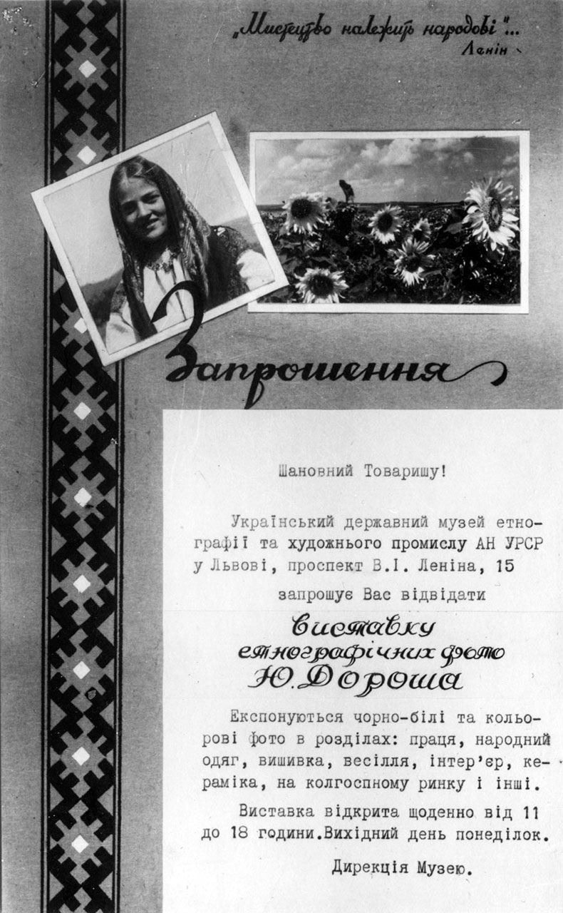 У 1960 р., при підтримці своїх товаришів, які працювали в етнографічному музеї, Данила Фіголя й Льва Долинського, Ю. Дорош відкриває свою першу персональну виставку етнографічних фотографій. Тоді ж у Москві до Декади українського мистецтва планується випуск серії художніх альбомів. До цієї роботи залучають Юліана Дороша, тоді вийшли друком окремі томи – це «Тканини і вишивки» та «Вбрання» , у Києві – монографія Ірини Гургули «Народне мистецтво західних областей України»