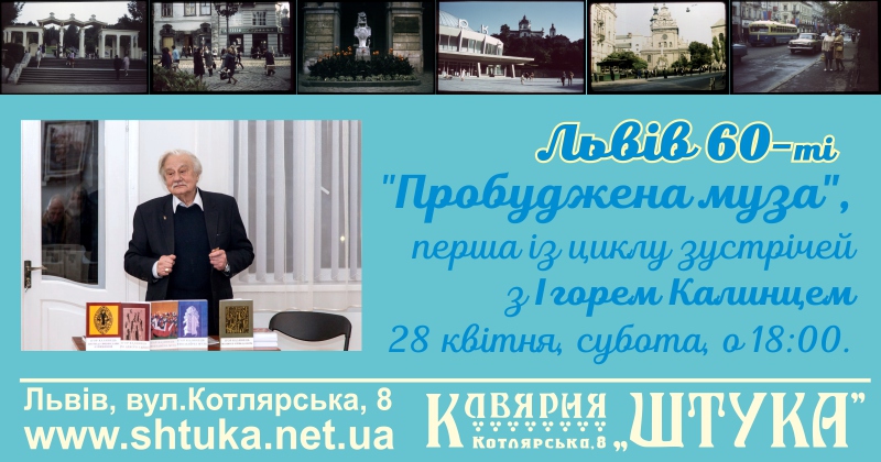 У суботу 28 квітня кав’ярня-галерея «Штука» (вул. Котлярська, 8 ) запрошує на першу із циклу зустрічей з поетом, дисидентом, громадським діячем і літературознавцем Ігорем Калинцем. Музичним доповненням вечора стане виступ Михайла Мануляка – композитора і засновника ВІА «Ватра». Початок о 18:00, вхід вільний.