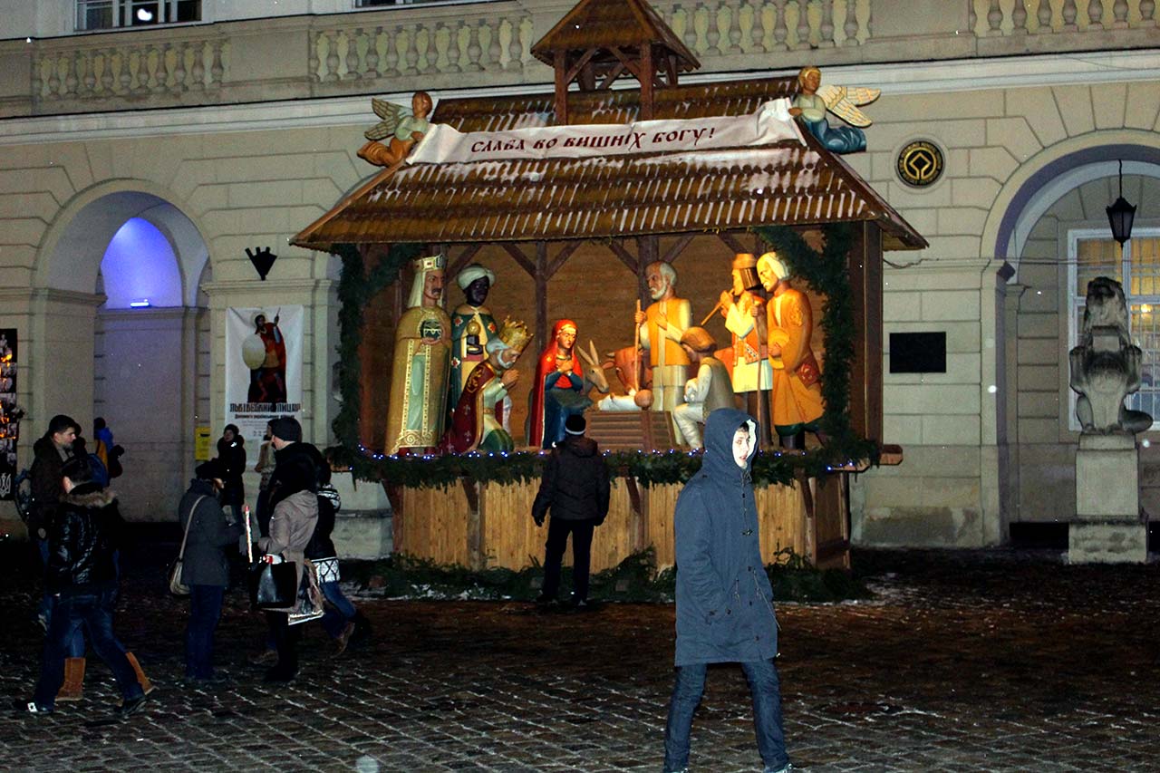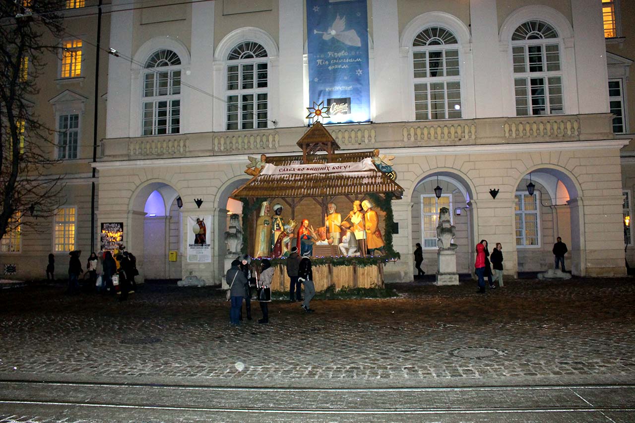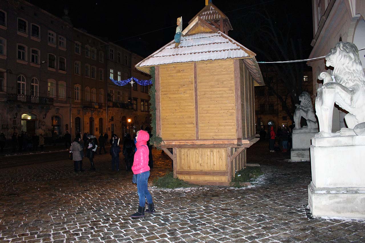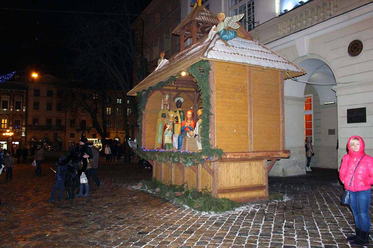 Різдвяна шопка, що стоїть на площі Ринок біля входу в Ратушу з 24 грудня, ще 2014 року, набуває найбільшої актуальності саме в сьогоднішній вечір. Адже саме сьогодні ввечері християни східного обряду скажуть один одному “Христос Родився!” і “Славимо Його!” пролунає у відповідь.