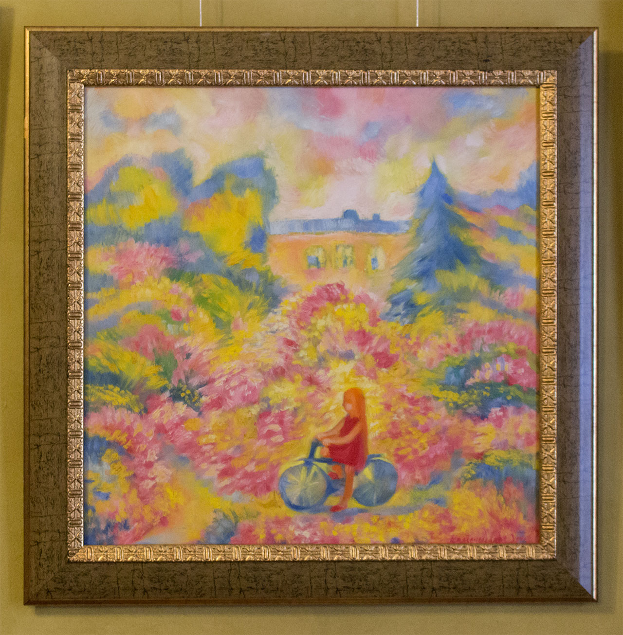 “В мене дитинство асоціюється з центром Львова. Наш двір, такий як колодязь, парк Костюшки, у якому в дитинстві гуляла, різні двори і велосипед – такий собі символ руху та розвитку. І такий був задум, щоб роботи були як на дитячих малюнках – яскраві, позитивні, оптимістичні. І кожна робота мала якийсь образ, відтінок – рожевий, жовтий, зелений, помаранчевий, бо, зазвичай, в дитинстві саме такі кольори”, – ділилася враженнями Олена Каменецька-Остапчук.