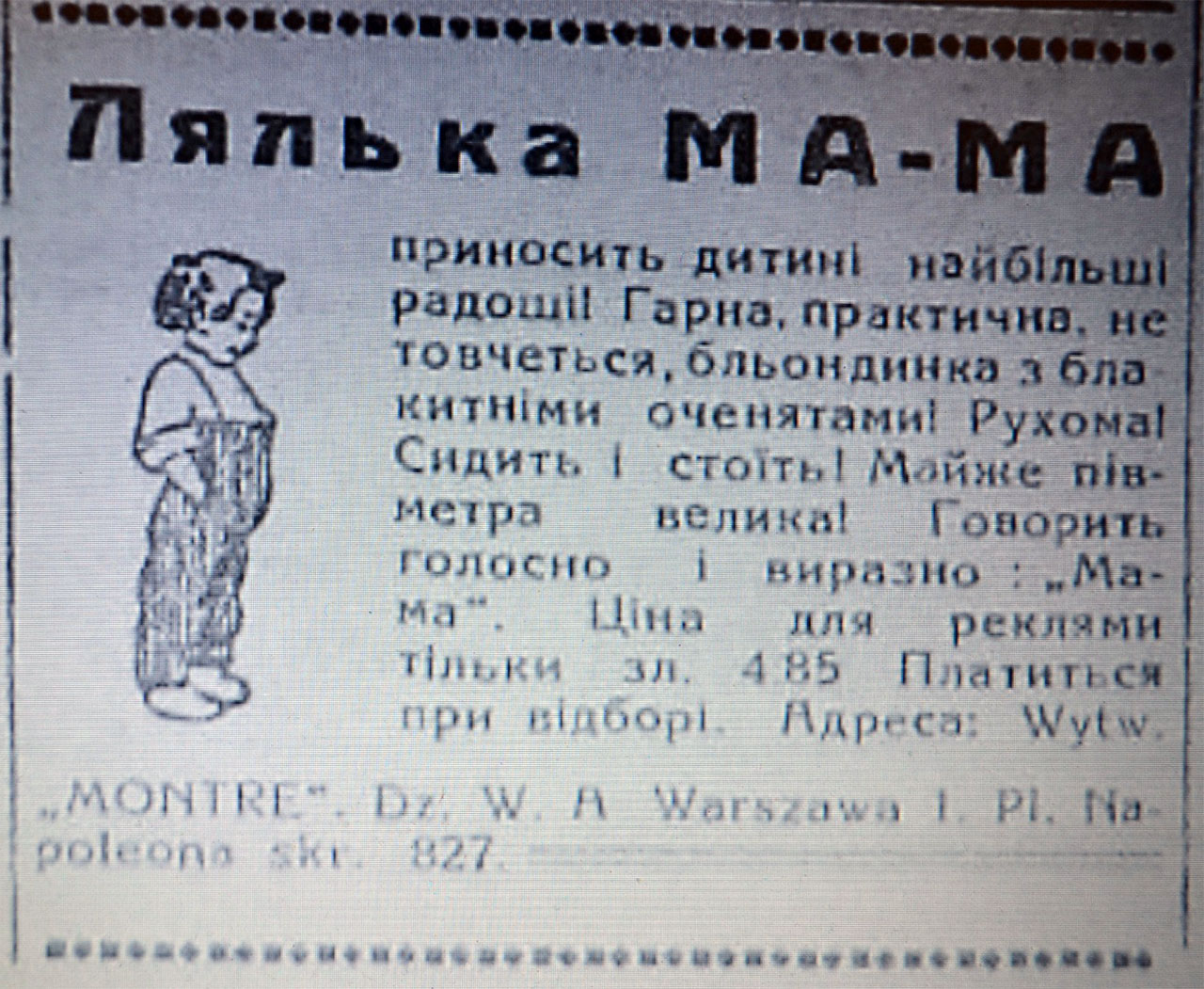 Для перших рекламних оголошень характерною була цікава форма ввічливих звертань до клієнтів, що зараз здається надто перебільшеною: “Прошу у Вельмишановної публіки поблажливого ставлення і запевнюю в якнайшвидшому і найретельнішому виконанні послуг” або “Повідомляю Вельмишановній публіці найпокірніше”. В середині 30-их років XIX ст. з’явилися різноманітні рамки, що обводили текст, шрифти, і своєрідний графічний елемент вказівного пальця, що орієнтує на назву фірми, товару чи адресу. Цей елемент спостерігається ще довго і не зникає навіть тоді, коли до оголошень починають поступово додаватися ілюстрації.