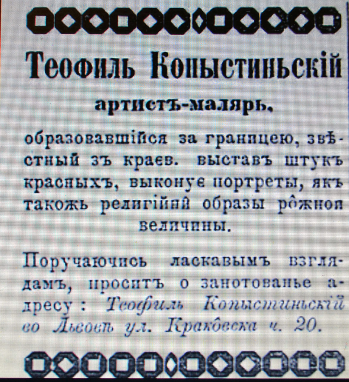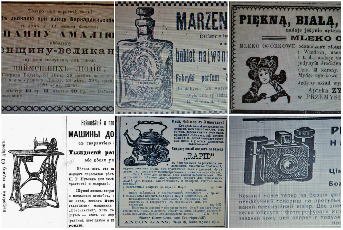 Особливістю рекламованих закладів, фірм було те, що вони були іменними. В сьогоднішні часи у Львові важко зорієнтуватися кому належить та чи інша аптека, друкарня чи магазин, що не скажеш про XIXст.- початок XXст. Чай зі складу І. Падевського, кравецький магазин братів Лянгнерь, аптека К. Крижановського, дім моди Л. Левена, фірма друкарських машинок С. Добжанського, ресторан М. Шпака, парфумерія С. Федера – продукція львівських і іноземних підприємців тих часів.