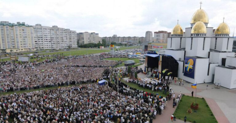 Вид на завантажену вул.Хуторівка. Радянські панельки на фоні сучасних ЖКЦерква Різдва Пресвятої Богородиці. Тут промовляв сам Папа Римський. МакДональдса тоді ще не було.Приїзд Папи у Львів, 2001 рік. Дерев на Сихові ще зовсім мало