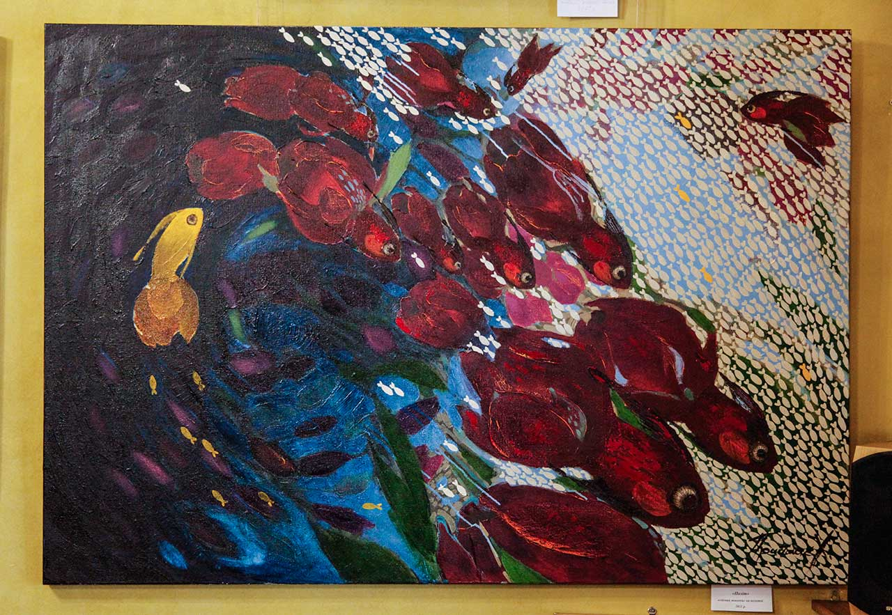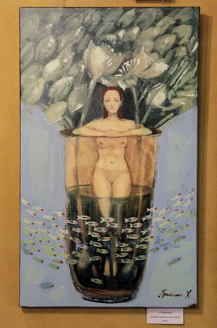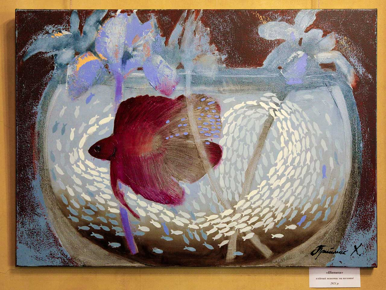 – Акваріуми і флораріуми це такі свого роду мікросвіти. Коли людина заходить в приміщення, де стоїть акваріум, то одразу до нього підходить. Він в першу чергу приковує увагу людей. Напевно тому що це мікросвіт, який існує самостійно, відірваний від навколишнього оточення і там завжди твориться чудо. Там все інакше, своєрідне, своїм життям живуть чудернацькі кольорові створіннячка. Це якесь маленьке диво. Дуже красиве і класне. Тому хотілося трошки запустити в свій живопис якогось сюрреалізму і поєднати з фігуративом. Тому в мене не можна однозначно сказати це акваріум чи ваза, рибки чи птахи. Створила якийсь такий чарівний, незвичний світ.
