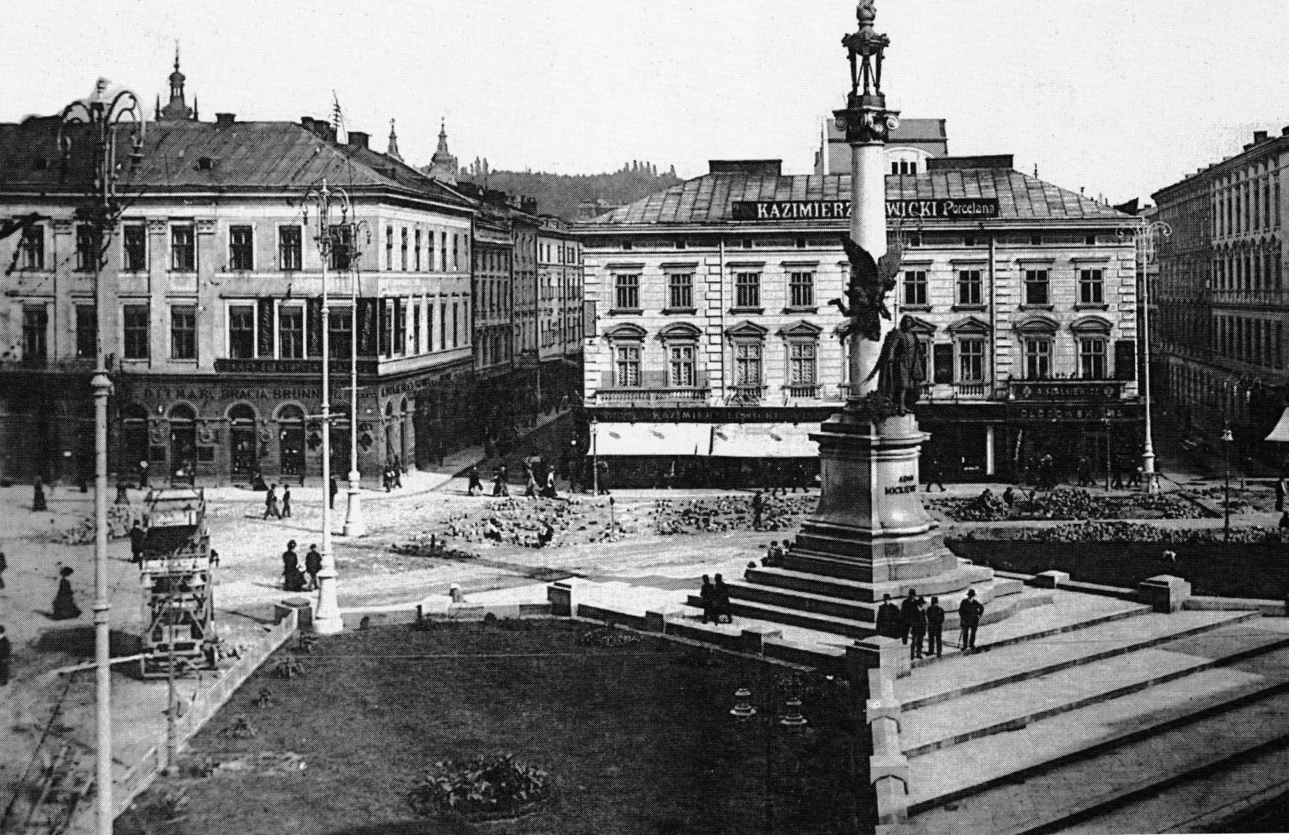 У 1904 році на нинішній площі Адама Міцкевича спорудили пам’ятник цьому видатному польському поетові (1798–1855). Новий монумент став одним із символів Львова. Коли наприкінці 1890-х наближалася сота річниця від дня народження поета, Літературне товариство його імені ініціювало створення Центрального ювілейного комітету. 26 червня 1897 року уклали план урочистостей, до якого входило встановлення пам’ятника поетові. Утворили спеціальну комісію задля будівництва монументу. Її головою обрали відомого літератора та мистецтвознавця Владислава Лозинського.